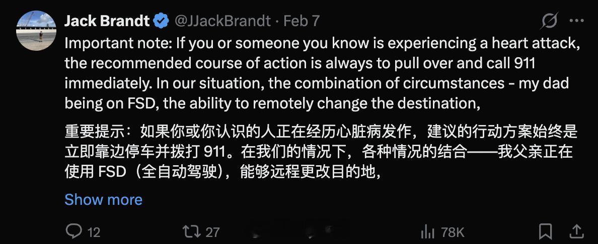 昨天有一个网友在 X 上分享了自己父亲被 FSD 救命的真实经历
