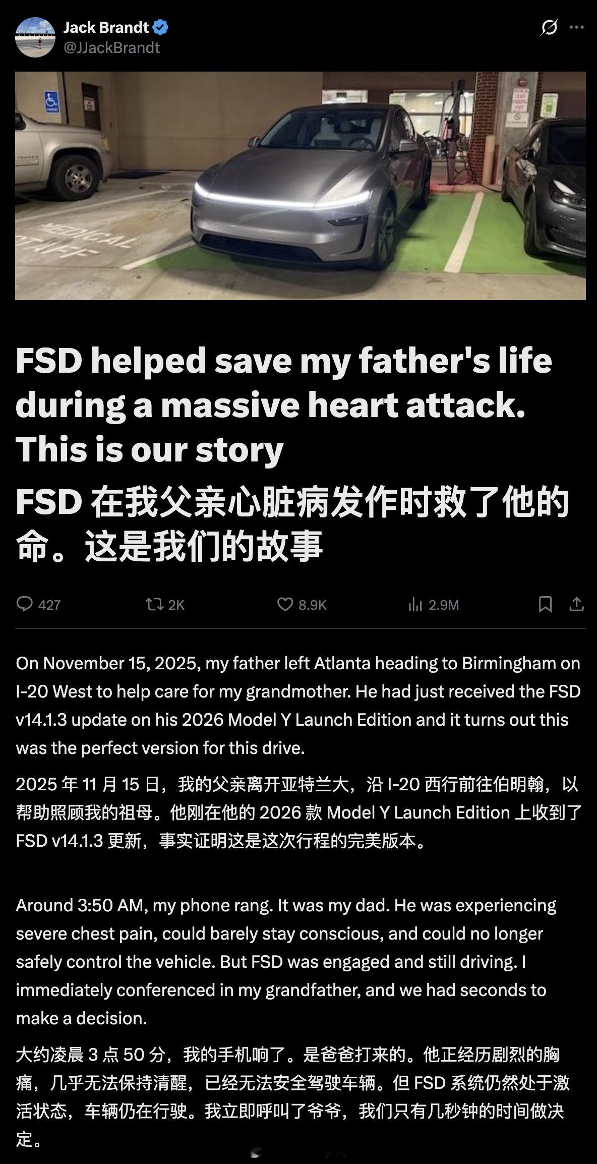 1. God(上帝)2. Tesla FSD kept the car safely on the road when my dad physically could not drive(特斯拉 FSD 在父亲身体无法驾驶时,将车安全地保持在路上)3. The Tesla app let me remotely redirect his car to the nearest hospital from miles away.(特斯拉应用让我能从遥远的地方远程将他的车引导至最近的医院)4. The INCREDIBLE team at was ready and saved his life(TannerHealth 的团队时刻待命,并救了他一命)