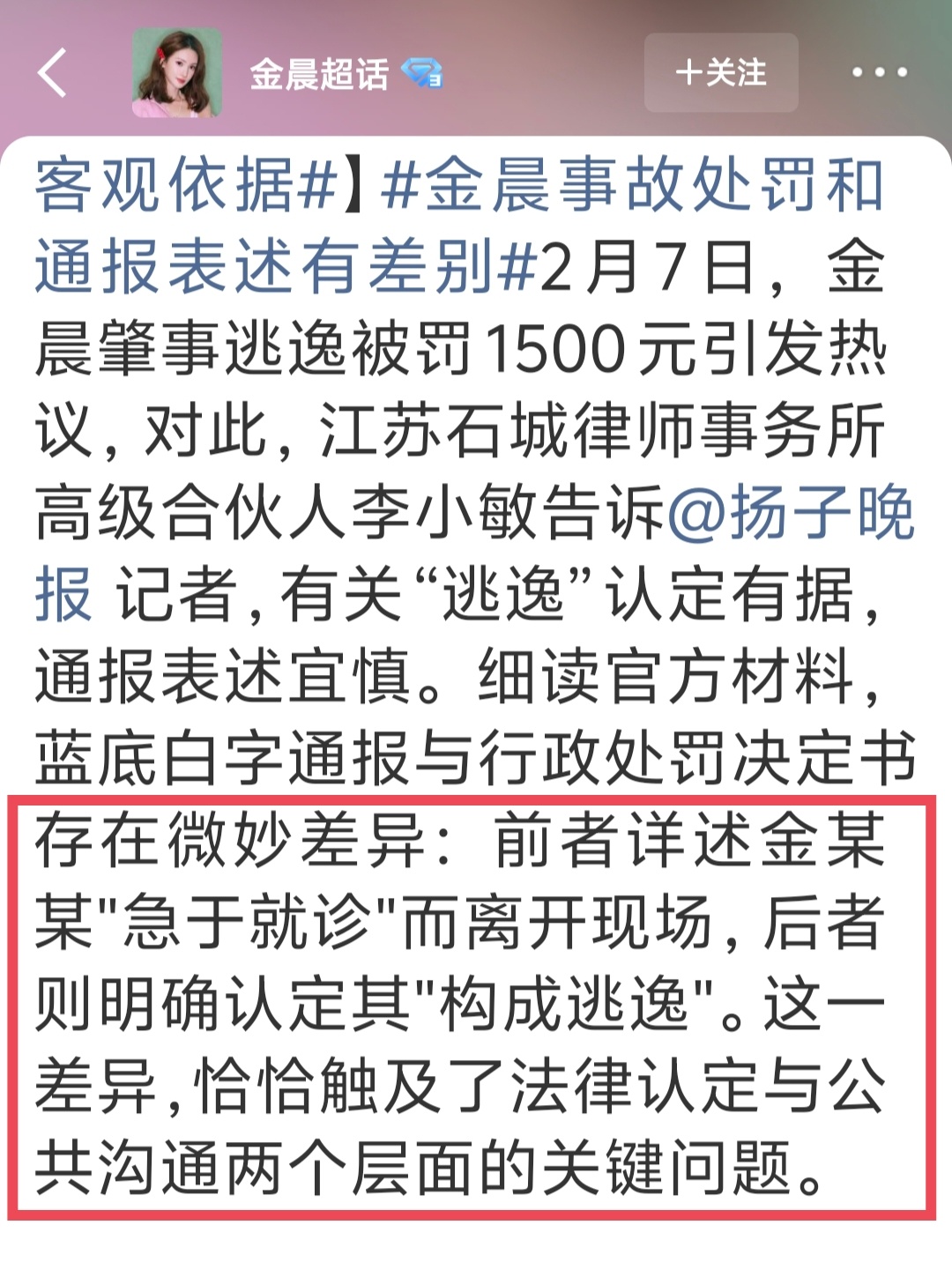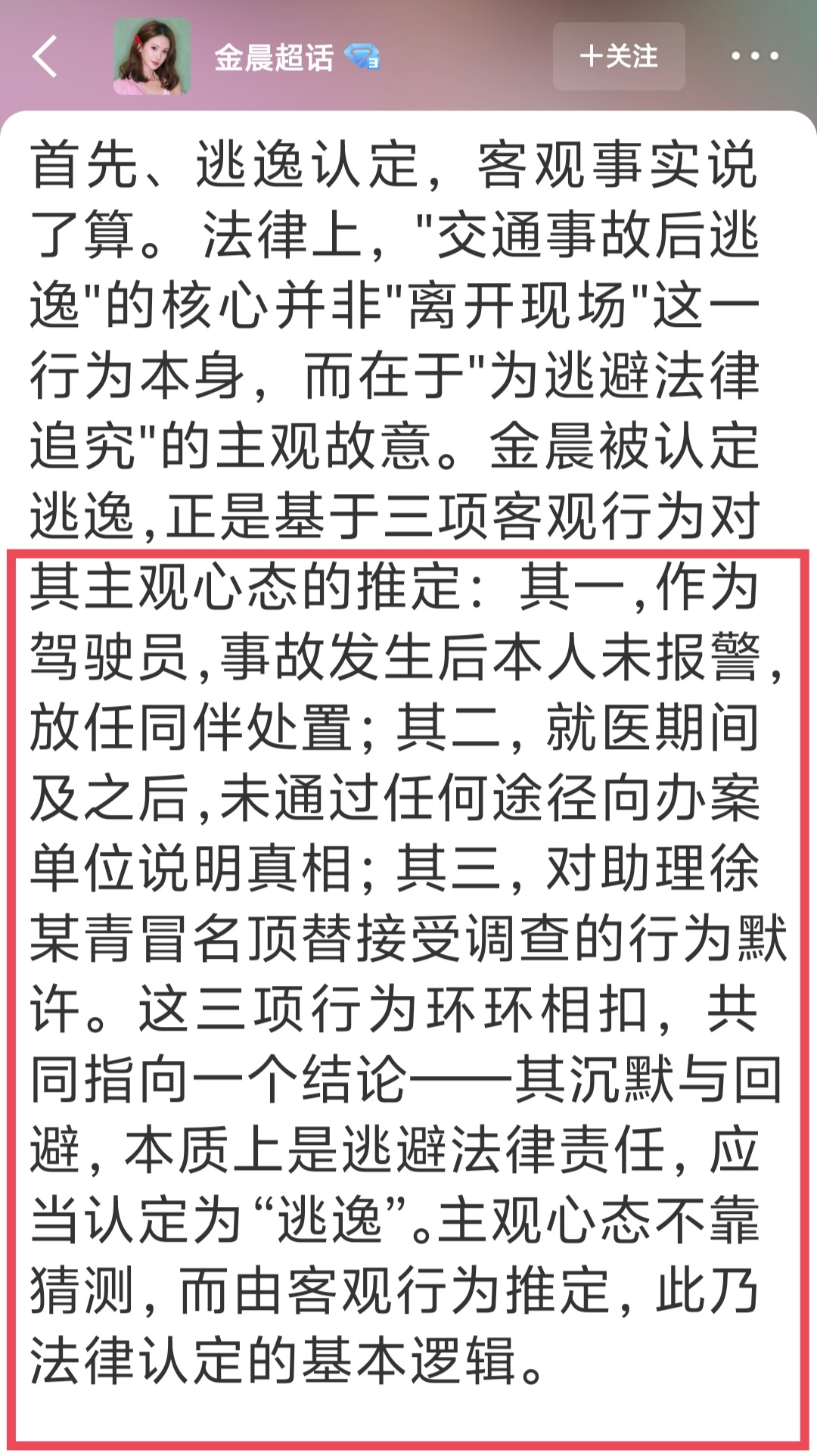 金晨被认定逃逸的三大客观依据 这个事情不光需要处理违法应该,还应该追责那些明目张胆包庇袒护行为!后者相比前者危害更大!
