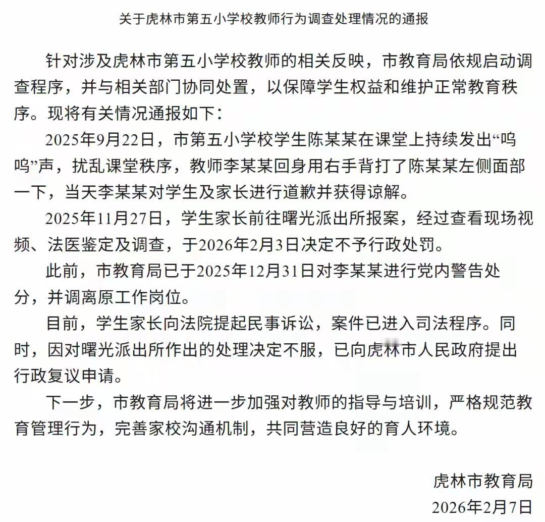 一记打在学生脸上的手背,在半年多后,依然回荡着余波。 去年9月,黑龙江虎林市第五小学的课堂上,一名学生持续发出“呜呜”声。教师李某某回身,用右手背打了学生的左侧面部一下。 事情发生后,看起来解决得迅速而彻底。当天,教师就向学生和家长道了歉,并获得了谅解。按照常见的剧本,这事可能就翻篇了。 然而,故事在两个月后发生了意想不到的转折。同年11月,学生家长走进派出所,正式报案。这一举动,让一桩看似已经“私了”的教育惩戒事件,滑向了法律程序。 经过查看监控、法医鉴定和调查,警方在今年2月初作出了“不予行政处罚”的决定。理由是,教师的行为是否构成违法情节,尤其是伤害程度,可能尚未达到治安处罚的标准。 但这并不意味着教师没有付出代价。早在去年底,当地教育局已经给出了党纪和行政处分:党内警告,调离原工作岗位。这是一个来自教育系统内部的明确态度:无论法律如何认定,其行为已违背师德,不适合留在教学一线。 可事情仍未结束。家长的诉求显然不止于此。目前,他们已向人民法院提起了民事诉讼,案件进入司法程序。同时,因对派出所不予处罚的决定不服,他们还向市政府提出了行政复议申请。 一场发生在教室里的短暂冲突,其影响链条正在不断延长:从当天的口头和解,到两个多月后的报警,再到纪律处分,最终走向民事法庭与行政复议。这清晰地勾勒出一条当下许多家校纠纷的典型路径:和解不再是终点,法律成为了寻求公正的最终战场。