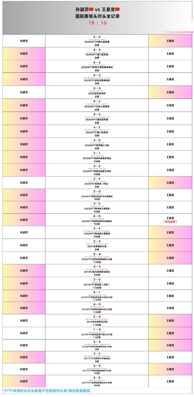 孙颖莎与王曼昱的头对头全记录——海口亚洲杯女单决赛对阵, 孙颖莎VS王曼昱! 2月8日晚19:30, 孙颖莎VS王曼昱, 从以往的交手记录来看, 孙颖莎对王曼昱保持18胜10负 的优势战绩, 但二人最后一次交手是在 第十五届全运会上, 王曼昱打败孙颖莎,蝉联 全运会女单冠军! 国际比赛的记录是北京大满贯, 王曼昱4:2孙颖莎,夺冠! 莎莎与曼昱是从小打到大的朋友, 国际比赛一共是28次, 国内比赛有53次, 是缠缠绵绵的队友和对手, 很庆幸,两个人都没有掉队, 就像莎莎在采访中说道, 当然希望能和曼昱会师决赛, 很感谢有曼昱这么优秀的队友, 激励我不断努力向前! 我和曼昱永远都是良性竞争, 是互相促进成长的好伙伴, 这次亚洲杯是莎莎检验伤愈后的 恢复情况, 一不小心又打进决赛, 不管输赢, 全力以赴做好自己,不留遗憾! 加油莎莎,加油曼昱! 期待今晚19:30女单决赛, 莎莎与曼昱的巅峰对决!