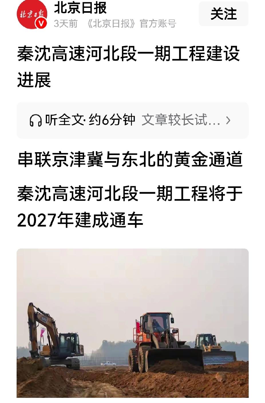 秦沈高速河北段一期工程近况(2027年2月5日)报道 近日,秦皇岛市昌黎县境内的秦沈高速,即北戴河新区至京秦高速段(秦沈高速河北段一期)的工程现场一片热火朝天。机器轰鸣声中,施工车辆往来穿梭不停。这条连接京津冀与东北的大通道,意义十分重大。 秦沈高速河北段一期工程,起于北戴河228公路,止于卢龙县京秦高速处,全长60.59公里,能大大改善京哈高速北戴河段的拥堵状况。 河北高速集团有关负责人介绍,秦沈高速河北段一期工程将于2027年建成通车。