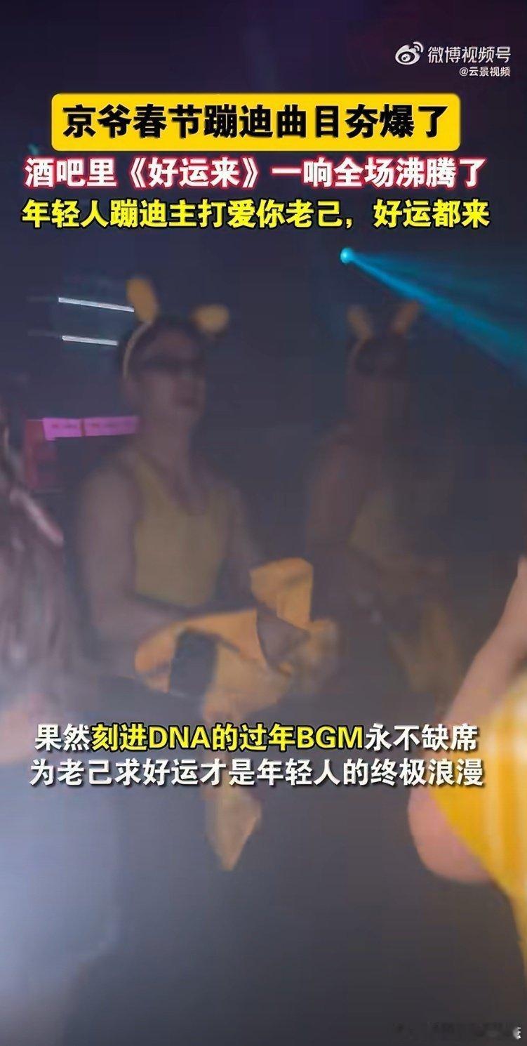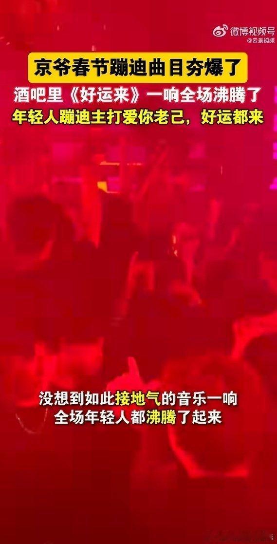 京爷春节蹦迪主打爱你老己京爷春节蹦迪曲目夯爆了 没有什么比《好运来》更适合春节蹦迪!北京酒吧现场太燃,年轻人用最嗨的方式迎新年,主打爱你老己、好运滚滚而来。