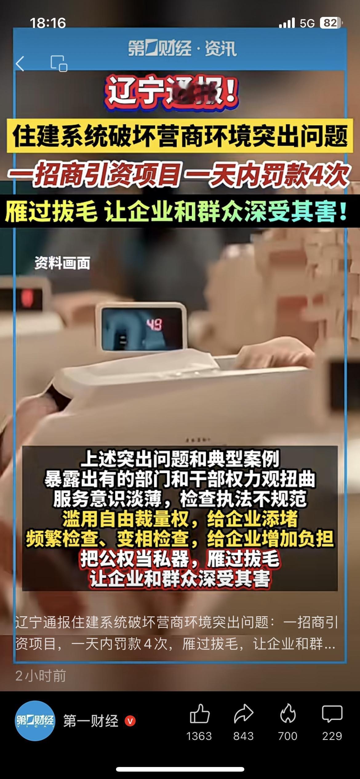 太离谱了!项目一天被罚4次,营商环境真要管管! 官方通报一批乱检查、乱罚款、吃拿卡要问题,企业敢怒不敢言。做工程的朋友说,就怕这种层层加码、雁过拔毛。好环境不是说出来的,是让企业敢来、敢投、敢发展。 你身边遇到过乱检查乱收费的情况吗? 营商环境 辽宁住建 民生热点