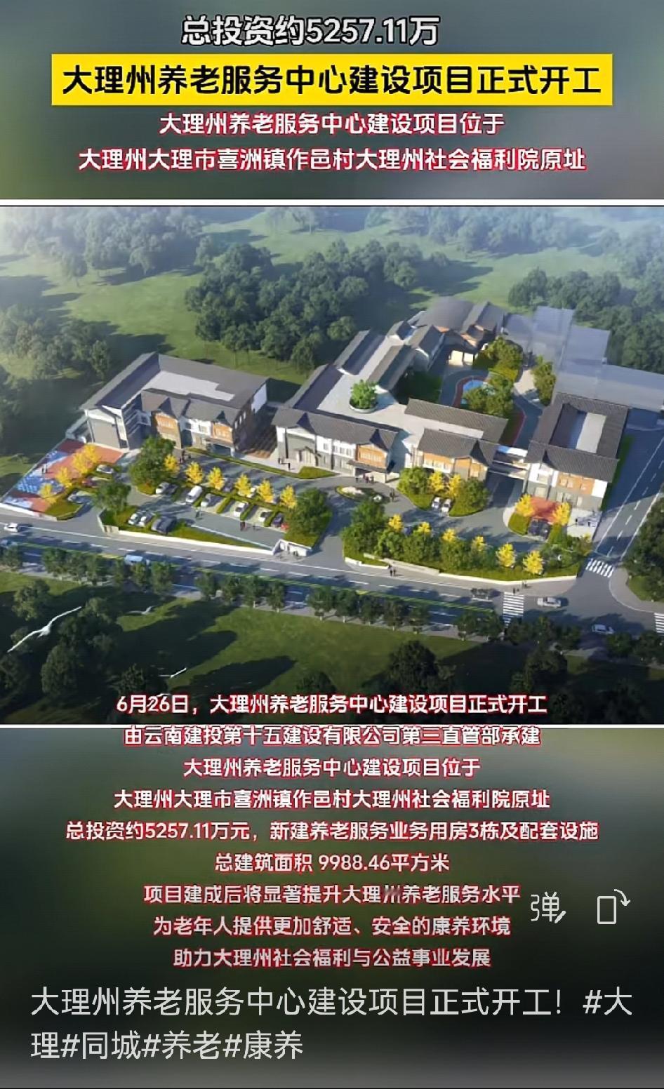 大理州养老服务中心建设项目全面封顶 2月7日,由第三直管部承建的大理州养老服务中心建设项目顺利实现全面封顶。 自开工以来,云南建投第十五建设有限公司项目部科学统筹人力、机械、物资等关键资源,全体人员坚守岗位,轮班奋战,以严谨务实的工作作风抓好过程管理,高效衔接每一道施工工序,凭借过硬的作风和专业能力保障项目稳步推进,提前达成了节点目标。 云南建投第十五建设有限公司项目部将继续保持攻坚状态,全力推进后续的二次结构、装饰装修及配套工程施工,高效打造让群众放心、暖心的工程,切实办好民生实事。 ··项目简介·· 大理州养老服务中心建设项目总用地面积11700.73㎡,总建筑面积9988.46㎡。建设内容涵盖3栋养老服务业务用房,以及医疗、照护、水电、消防、通信等全套配套设施,是完善大理州养老服务体系的重点民生工程。 该项目位于喜洲镇作邑村大理州社会福利院内,新建3栋养老服务用房及医疗、照护等配套设施,规划床位230张。 项目于2025年6月动工,2026年2月全面封顶。建成后将提供医养结合服务,还将作为全州养老服务实训示范点。项目总投资5257.11万元,采用智慧化设计,融入白族建筑元素,是大理州完善养老服务体系的关键项目。