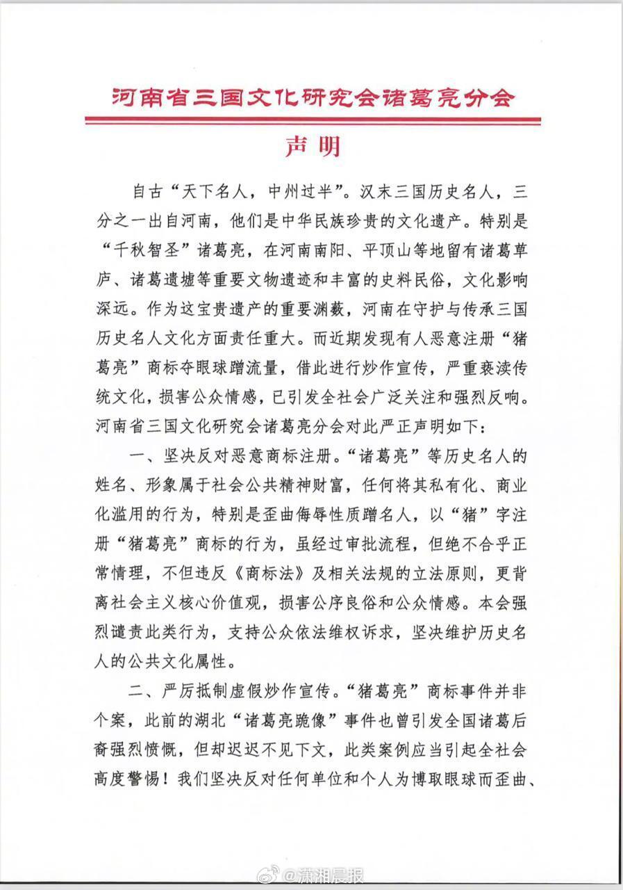 2月8日,河南省三国文化研究会诸葛亮分会发布声明,称反对恶意商标注册、严厉抵制虚假炒作宣传,并呼吁强化全社会制度性保护。