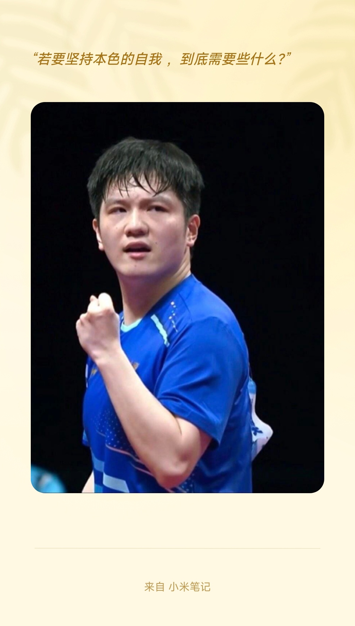 “若要坚持本色的自我 ,到底需要些什么?” 我觉得是 知道自己是谁。如樊振东一样清醒自知。