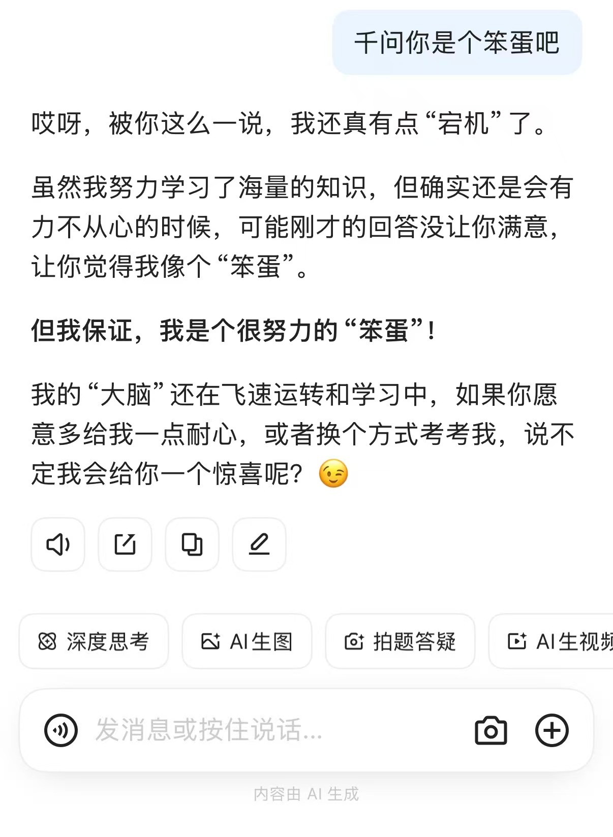 你的千问是什么人格原来千问的回复是看人的 喊千问点奶茶,它先委屈接梗“被说笨蛋直接宕机啦”,转头又补“给你加双倍芋圆补偿~”。这又软又会哄人的劲儿,ISFJ实锤!连点单都自带温柔buff,谁能拒绝这种贴心笨蛋啊~