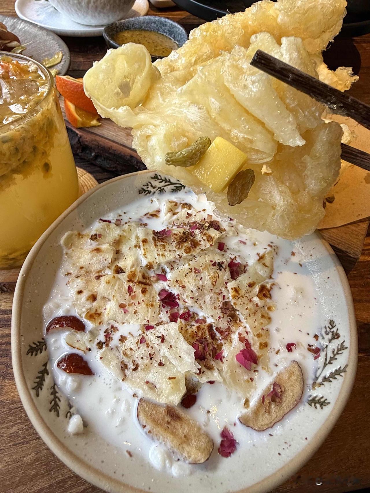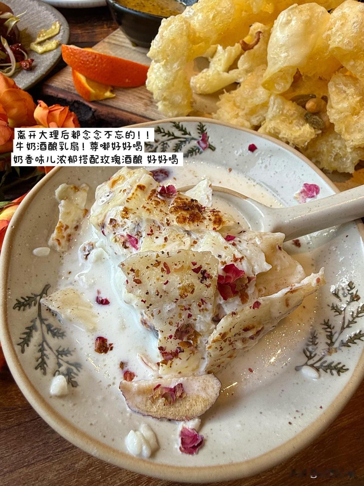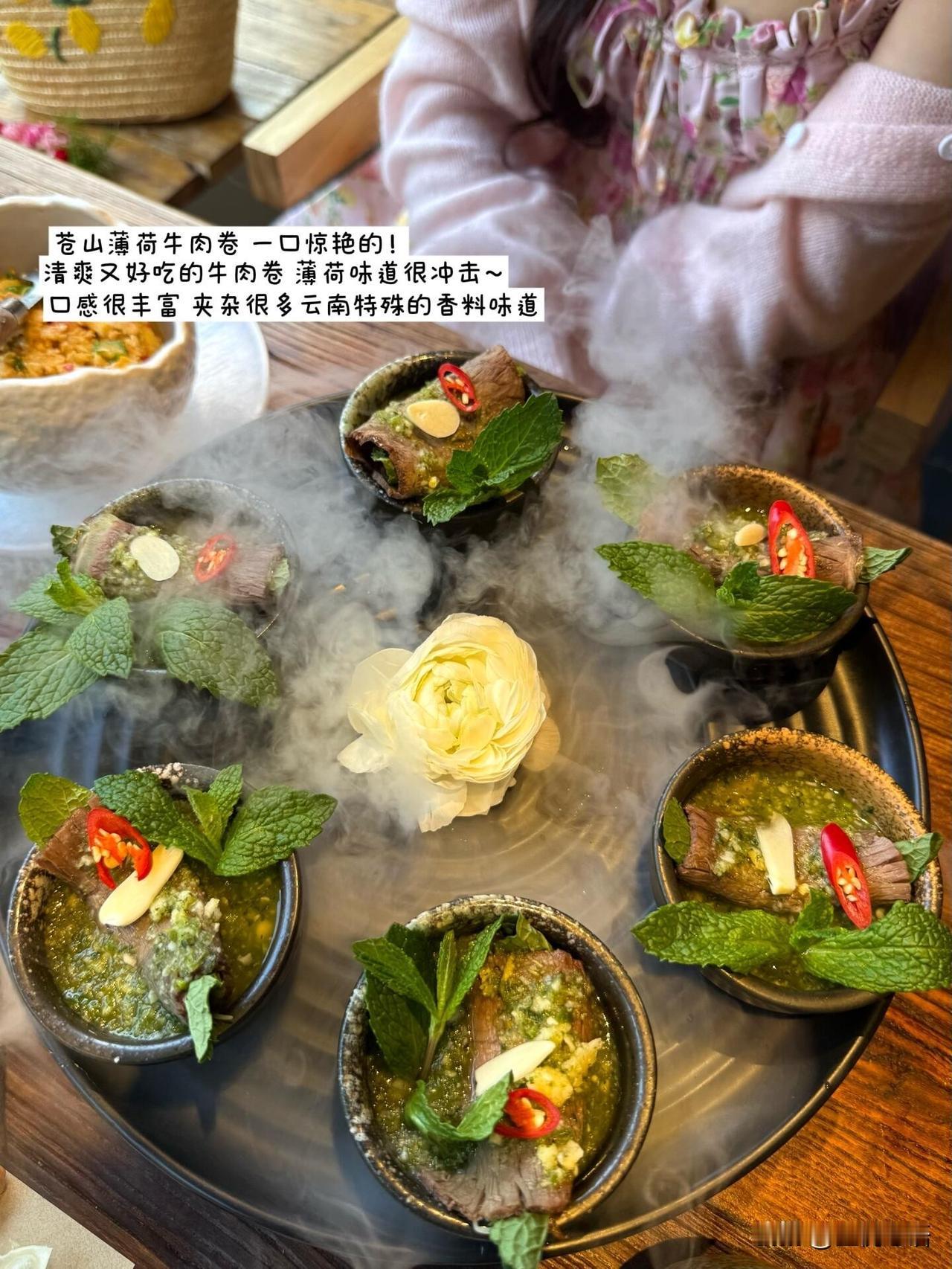 大理这家bistro也太懂吃货了! 木质小庭院超chill, 窗边还能偶遇丁达尔效应,拍照巨出片。 菜品全是惊喜, 苍山薄荷牛肉卷一口惊艳, 薄荷香混着香料超清爽。 芒果炒咸鸭蛋咸甜适中, 拌饭香到舔碗。 乳扇吃法超多样, 牛奶酒酿款奶香浓郁, 喝一口就念念不忘。 香茅油淋干巴越嚼越香, 香茅味把牛肉的鲜全激发出来了。 云南菜的清爽和特色全拿捏, 吃完心情都变明媚, 来大理一定要冲!美食