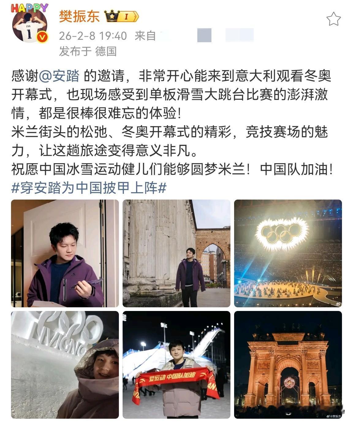 2月8日,樊振东罕见更新动态。东东受邀到意大利米兰观看冬奥会开幕式,并为中国冰雪运动健儿们加油助威。 东东发了6张照片,其中有4张是单人照。 樊振东身披深紫色连帽冲锋衣,内搭黑色圆领针织衫,下身搭配黑色休闲长裤和白色运动鞋,整个人看上去非常帅气。 目前,东东还在德国,难道他真的不回来过年了吗?