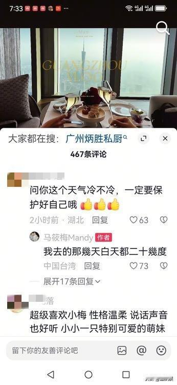 2月8日下午,马筱梅在自己的抖音賬号发布了最新视频,还在评论区回答了网友关心的问题。 视频中,马筱梅温柔地介绍着她前几天在广州看到的美景和吃到的美食。 她晒出开心地吃了白天鹅酒家的著名茶点天鹅酥和沙琪玛,马筱梅边吃边惊叹:“我的天哪,也太好吃了!” 她还去看了广州著名的小蛮腰,还去沙面逛街……。 在广州明媚的阳光的映射下,马筱梅也特别娇媚好看。 有网友在评论区问她:“广州冷吗?”马筱梅回复说:“我在的那几天白天天气都是二十多度。” 她回复时,IP显示是中国台湾,很显然,她已经结束了广州的行程回台北待产了。 视频中,感觉马筱梅心情很好,全然不受这几天S家那么的活动与言论所影响。 孩子们和汪小菲都没有出镜,应该是不想因此引发议论。 从中可见,她还是很有智慧的,懂得在这复杂的关系中泰然自处,置身于事外,专心地和汪小菲享受生活和照顾好小家庭,用美景与美食安抚汪小菲与小双继子女的情绪,马筱梅双商很在线,汪小菲这次娶对人了。