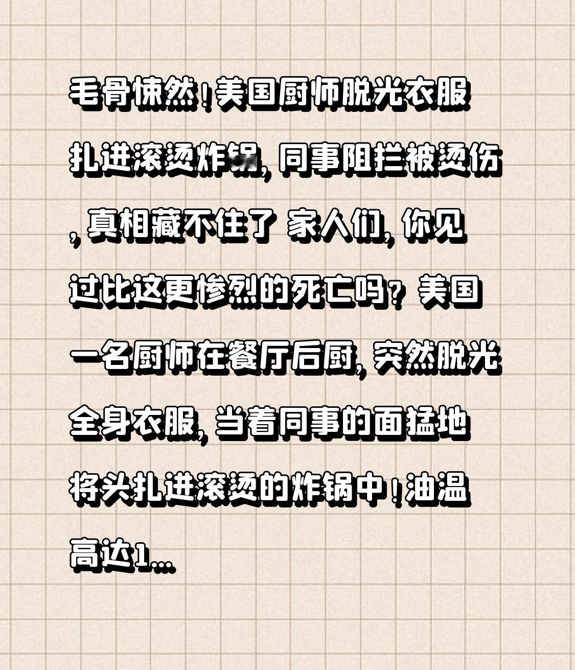 毛骨悚然!美国厨师脱光衣服扎进滚烫炸锅,同事阻拦被烫伤,真相藏不住了 家人们,你见过比这更惨烈的死亡吗?美国一名厨师在餐厅后厨,突然脱光全身衣服,当着同事的面猛地将头扎进滚烫的炸锅中!油温高达180℃,瞬间的皮肉灼烧声让在场的人魂飞魄散,这起离奇命案至今让人脊背发凉。 事情发生在美国宾夕法尼亚州的一家餐厅,当天后厨像往常一样忙碌,突然30多岁的厨师约翰(化名)做出了惊人举动。他二话不说脱掉所有衣物,眼神空洞地走向正在工作的炸锅,在同事还没反应过来的瞬间,就一头扎进了翻滚的热油里。旁边的女同事吓得尖叫,下意识冲上去拉扯,却被飞溅的热油烫伤手臂,一名正在就餐的顾客也试图上前阻止,但终究没能挽回悲剧。 医护人员赶到时,约翰已经浑身重度烧伤,皮肤大面积焦糊,尽管紧急送医抢救,最终还是因伤势过重不治身亡。事发后餐厅紧急关闭了数天,重新营业时门口围满了媒体,可无论记者怎么追问,餐厅和警方都只回应“这是一起试图自杀事件”,拒绝透露更多细节。 这个回应瞬间引发全网质疑,网友们纷纷扒出疑点:一个正常工作的厨师,为何突然做出极端行为?是长期抑郁还是遭遇了什么变故?更让人疑惑的是,美国餐饮行业近期事故频发,去年10月麦当劳曾爆发大肠杆菌污染事件,导致14个州104人感染、1人死亡,当时就有媒体曝光餐饮从业者压力巨大,长期面临超时工作、薪资微薄的困境。 有曾在该餐厅工作过的网友匿名爆料,约翰已经在店里干了5年,最近几个月状态一直很差,经常被老板PUA,还因为一点小失误被扣了半个月工资,事发前几天曾和同事抱怨“活着太累”。但这些说法都没有得到官方证实,警方始终以“保护隐私”为由拒绝透露约翰的背景信息和事发原因。 更让人揪心的是,阻拦约翰的女同事不仅身体受伤,心理也留下了严重阴影,现在已经不敢再从事餐饮行业。有心理医生分析,从“脱光衣服”这个反常举动来看,约翰大概率处于严重的精神崩溃状态,选择这种极端方式结束生命,背后可能藏着不为人知的痛苦。 这起悲剧让无数人陷入深思:我们总在关注食品安全,却忽略了餐饮从业者的身心健康。他们每天在高温环境下工作,面对顾客的挑剔、老板的压榨,还要承担巨大的安全风险,长期的精神压力很容易压垮一个人。就像去年美国网红厨师因心理健康危机持刀袭警被击毙一样,职场人的心理防线真的需要被重视。 生命从来都不该以这样惨烈的方式落幕,每个看似反常的行为背后,可能都藏着无数次无声的求救。无论是餐饮行业还是其他职业,多一份理解、少一份压榨,或许就能避免一场悲剧。 你觉得厨师自杀的背后还有隐情吗?该如何关注职场人的心理健康?评论区聊聊你的看法,点赞转发,让更多人看到这起悲剧背后的警示!