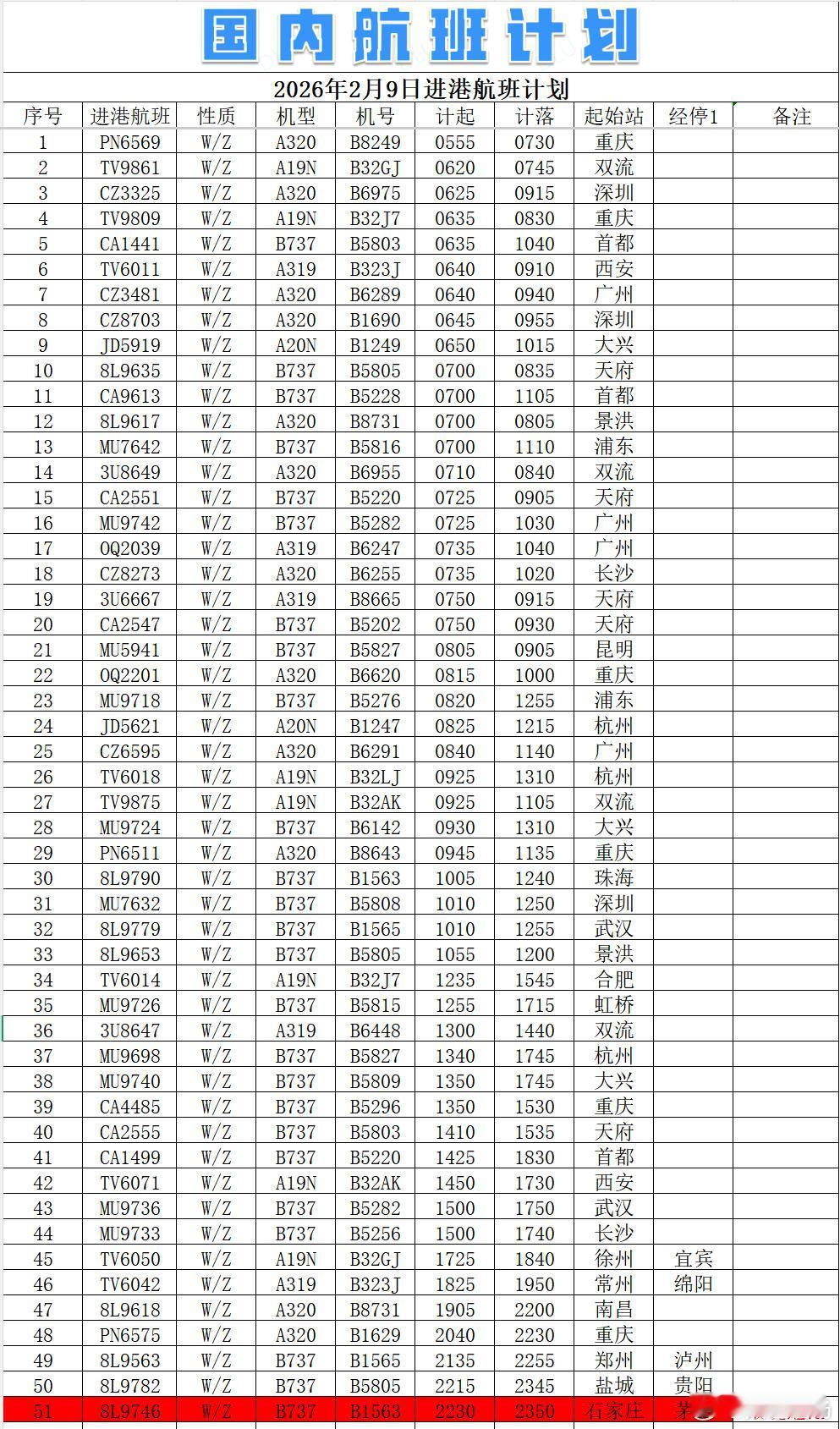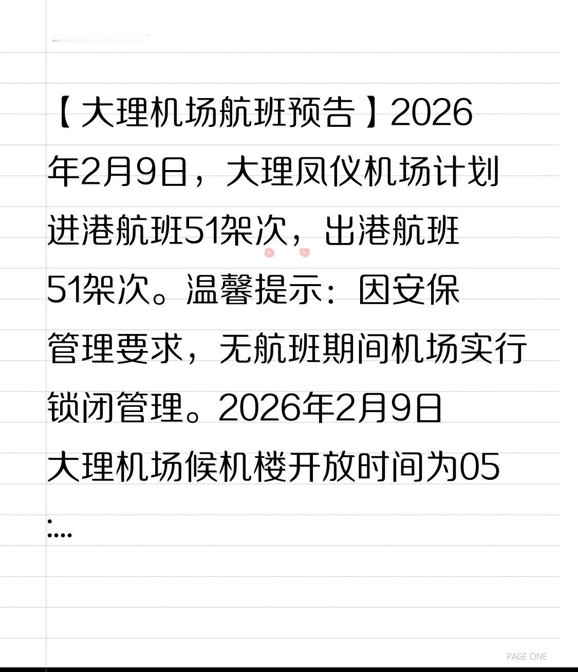 【大理机场航班预告】2026年2月9日,大理凤仪机场计划进港航班51架次,出港航班51架次。 温馨提示:因安保管理要求,无航班期间机场实行锁闭管理。2026年2月9日大理机场候机楼开放时间为05:00,请广大旅客合理安排出行时间。 机场航班时刻表 机场航班调整 机场周航班量 大理国际机场 凤仪机场