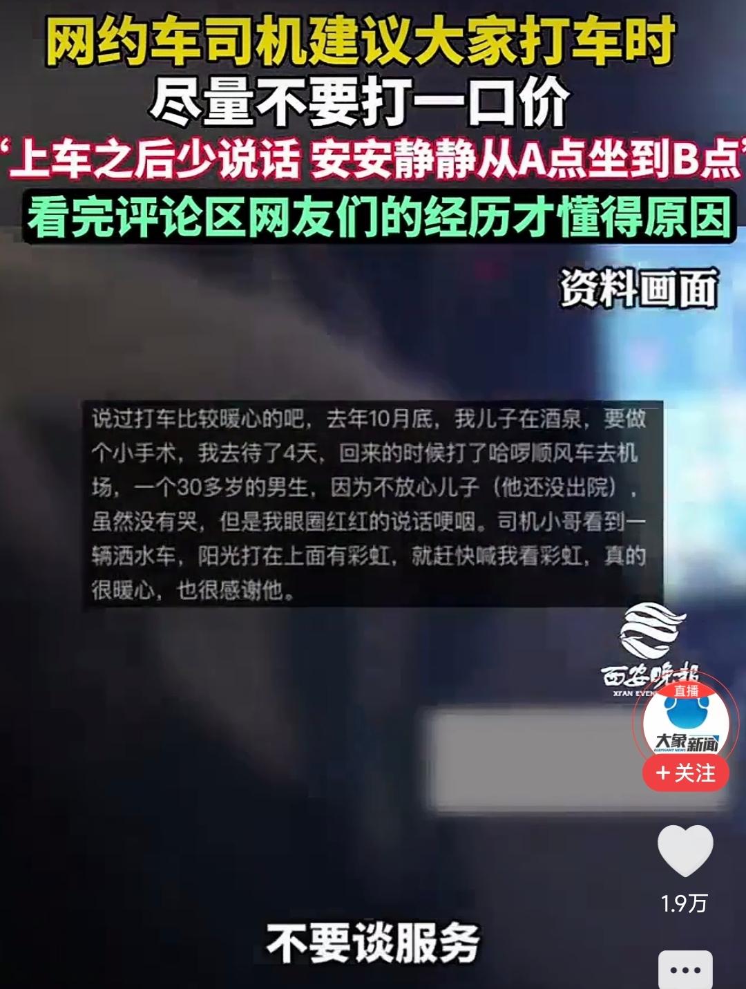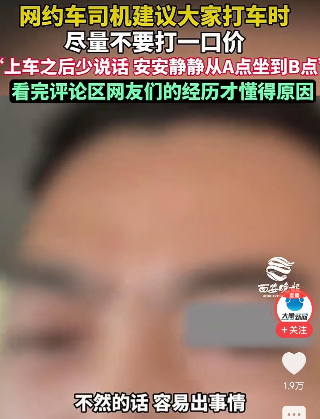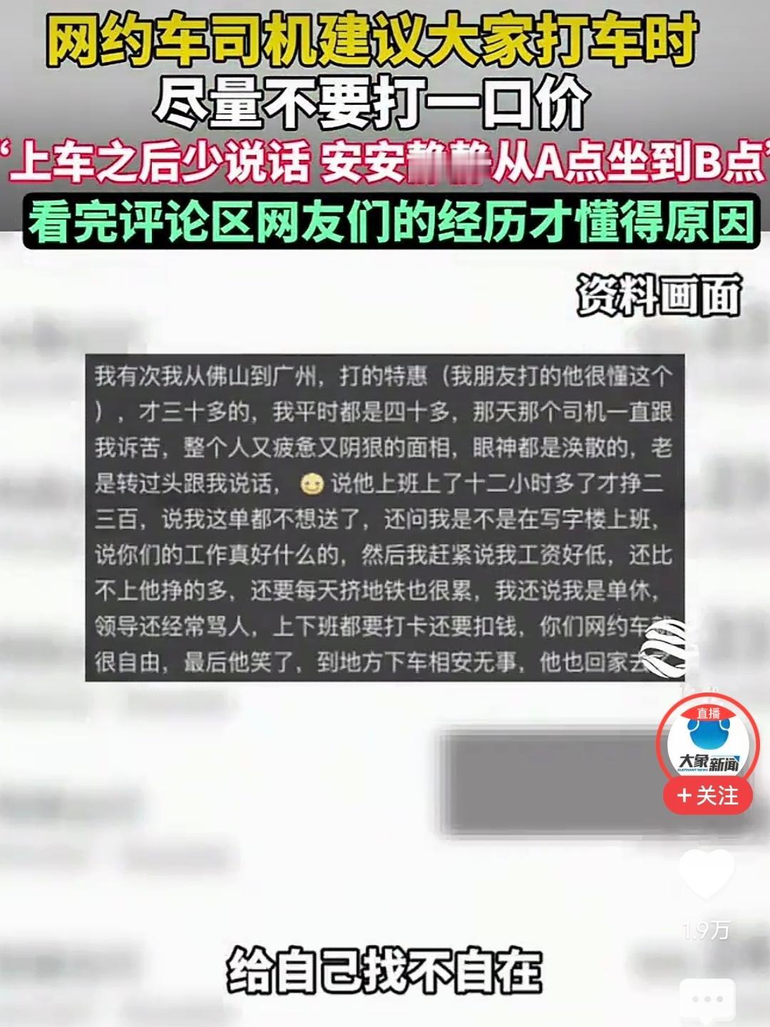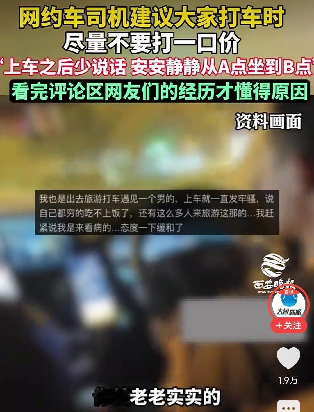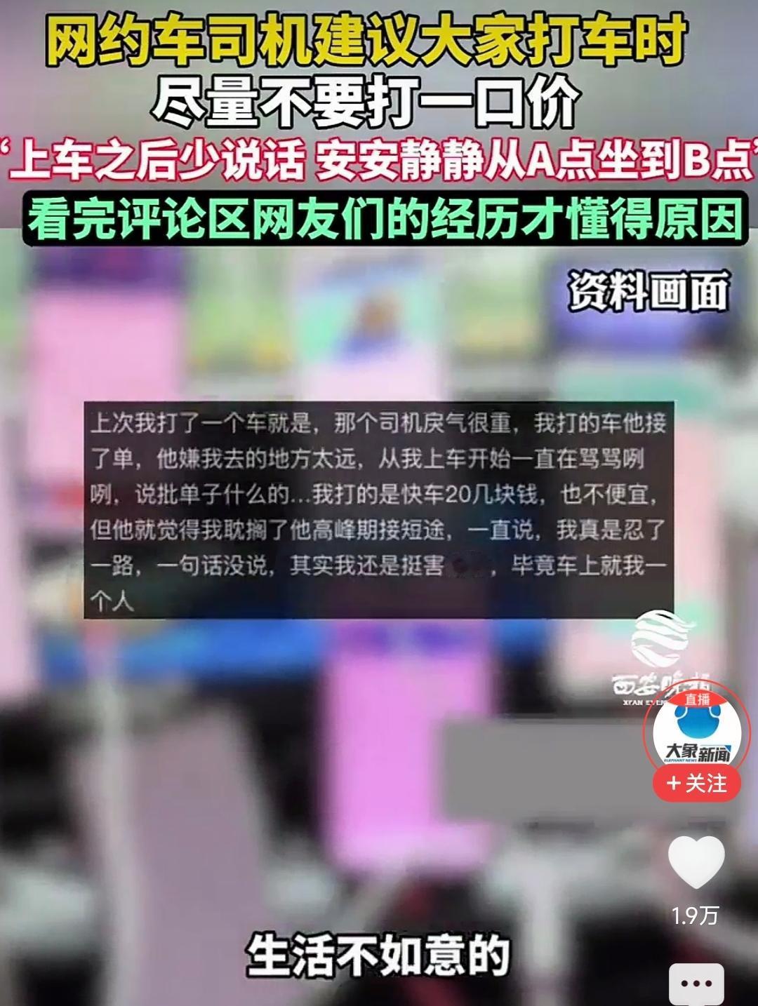 一位网约车司机的肺腑之言,让人听完后不寒而栗!今后这车咱打还是不打? 最近有位网约车司机发视频奉劝所有人:“你们就老老实实打快车和专车,别去为了省那几块钱,给自己找不自在。更别谈什么服务态度,上车后少说话,不要激怒司机,不然很容易出事情!” 看到这你是不是一脸懵?接下来他做出了解释:现在的网约车司机,很多是失业的、负债的、还有生活不如意的,都来我们这个行业了,那情绪可能一点就炸。 说实话,听他说完后人头皮发麻,网友更是炸了,这以后还敢打车? 但就我个人来看,其实不必过度解读,更不必一竿子打翻一船人。我相信他说的有部分是真的,但不至于到这么夸张的地步。打个车提心吊胆的,绝对是言过其实了。 我经常乘坐网约车,虽然也遇到过一些脾气不好的 ,但绝大多数司机是本分善良的。他们养家糊口,只是被现在的低价单、高抽成、超长工时压得没了笑脸,更谈不上服务质量了。 长年累月为了生活奔波,车厢很小,装得下生活重压,也藏着随时被点燃的戾气。其实真正可怕的不是网约车,而是双向的不理解,和被忽略的情绪底线。 有些乘客觉得,我花钱打车,就该得到你的服务:路线不对要被质疑,态度不好要被投诉, 一天挣不了几个钱,司机的心里也很苦。 你想啊,单价那么低,流水上不去、成本又下不来,一天跑十几个小时,稍不顺心就被乘客差评、扣钱,哪能挤出来笑脸? 当“服务至上”撞上“生存至上”,矛盾就会一触即发。那位司机的劝告,也许不是恐吓,是一些人被逼到绝境的无奈预警,也是对所有人的安全提醒。 我们能做的,就是守住边界、相互尊重。别把司机当成出气筒,别颐指气使,故意刁难。更不要不苛求那些超出合理范围的“完美服务”,多一些理解,少一点挑剔。 现在这个社会,大家生活都不容易,谁都在硬扛。你尊重他的辛苦,他守护你的安全,这才是最稳的平衡状态。 在我看来,网约车可以打,但不管是乘客还是司机,请都少一点戾气,多一点体面和尊重。 服务先靠边站,平安抵达才是你真正的目的。