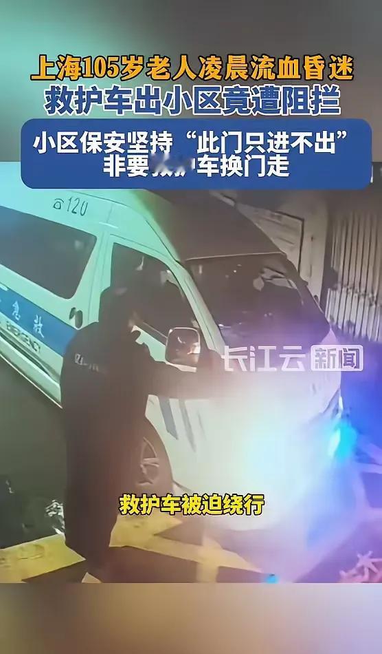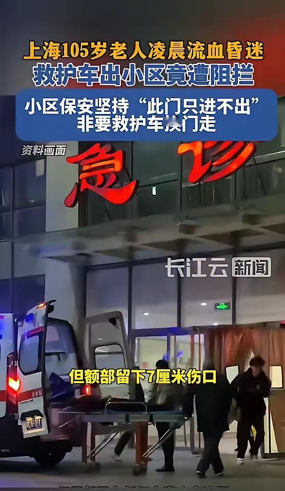 “必须严惩!”1月31日,上海,一105岁老人在家中摔倒,额头严重受伤,流血昏迷,在救护车运送过程中,因小区保安以“东门只进不出”为由,坚持让救护车换个门走,救护车只能绕行,被硬生生耽误5分钟!网友:拿着鸡毛当令箭! 1月31日凌晨,上海一位105岁的老人在家中不慎摔倒,额头严重受伤,当场流血昏迷,情况十分危急。家属发现后立刻拨打120,救护车很快赶到小区东门,顺利进入小区将老人接上了车。 可就在救护车准备从东门驶出、赶往医院的时候,小区保安却拦在了车前,说东门的规定是“只进不出”,坚持要求救护车换个门绕行。医护人员和家属反复说明情况,强调老人伤势危重、每一分钟都耽误不得,但保安始终不为所动,死死守着门禁规定不肯放行。 无奈之下,救护车只能按照保安的要求,掉头绕行到其他出口,这一来一回,硬生生耽误了5分钟的宝贵时间。最终,救护车虽然将老人送到了医院急诊,老人也脱离了生命危险,但额头上还是留下了一道7厘米长的伤口,而那被耽误的5分钟,也成了家属心中难以释怀的遗憾。 幸亏老人没有什么大碍,要是情况再严重一点,这被耽误的5分钟很可能就会造成无法挽回的后果,到时候保安肯定要承担相应的责任,家属也绝不会善罢甘休。这件事也再次提醒我们,任何规则都不能凌驾于生命之上,机械执行规定而漠视紧急情况,不仅是失职,更是对生命的不尊重。 各位读者你们怎么看?欢迎在评论区讨论。
