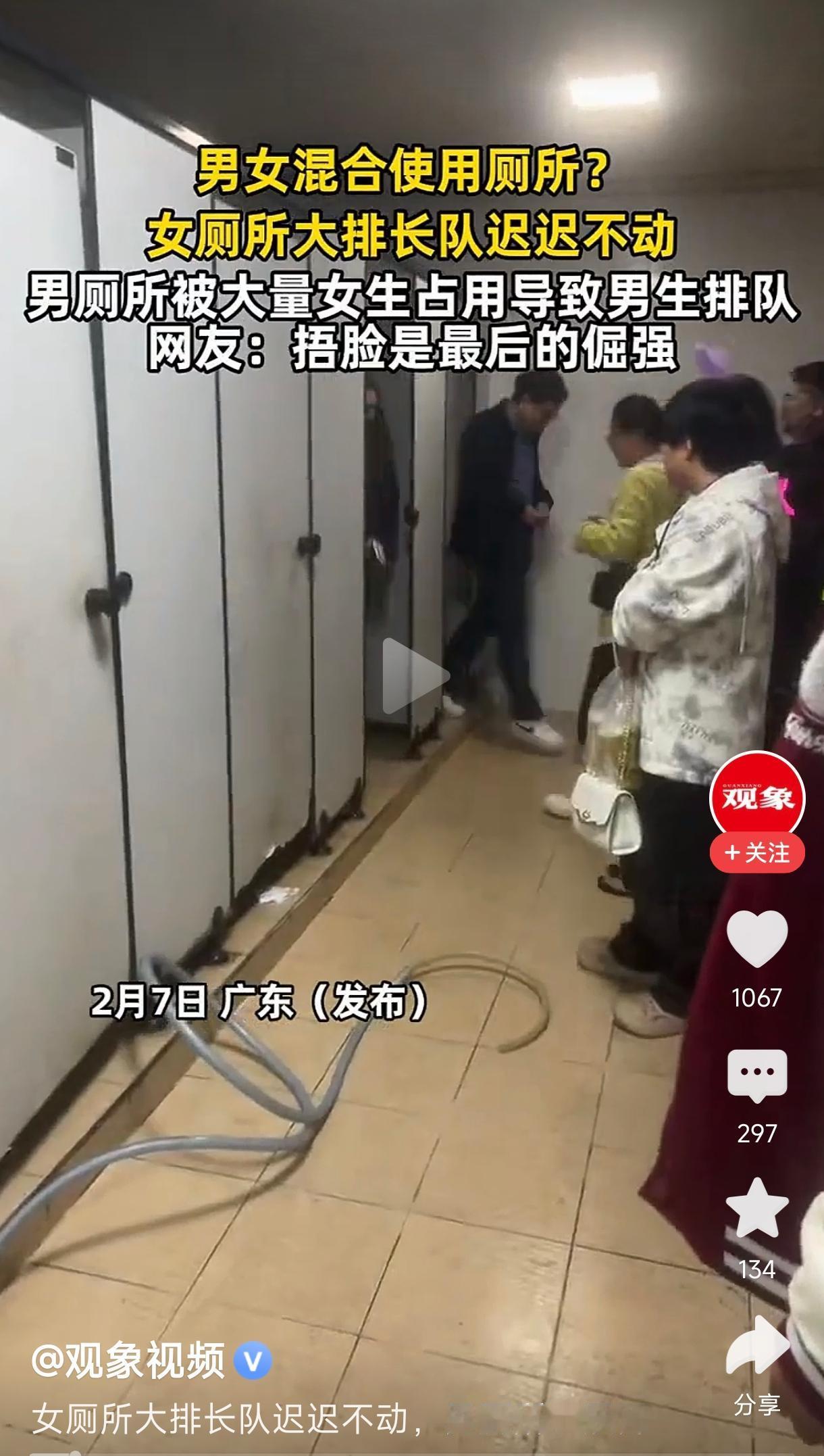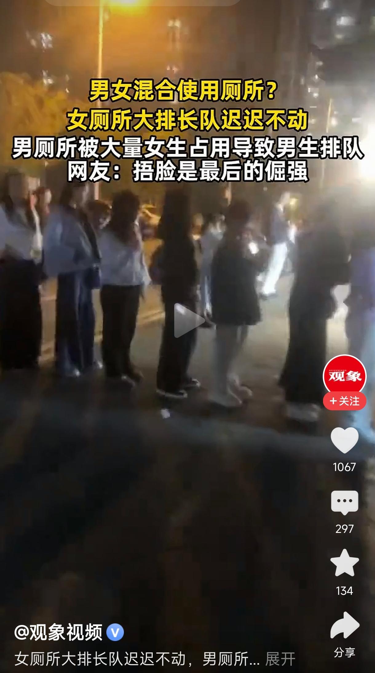 女厕所排队长大量女生占用男厕所 反映了公共厕所使用的实际情况,可能引发一些有趣的讨论和思考。以下是一些可能的角度和分析: 公共厕所的使用习惯:女厕所通常人流较大,排队时间长,而男厕所相对较少使用或更快,这导致女生在高峰时段占用男厕所,可能是因为女厕所排队时间太长。 设计与管理问题:公共场所的厕所布局和容量可能没有充分考虑到不同性别的使用需求,导致在高峰期出现排队和占用的现象。 社会与文化因素:女生可能因为生理期或其他原因更频繁使用厕所,且排队时间长,导致一些女生选择占用男厕所,避免排队。 网友的反应:评论中的“捂脸是最后的倔强”表达了一种无奈和调侃,反映出公众对这一现象的既无奈又觉得有趣的心情。 建议与改善措施:增加公共厕所的容量与数量。优化厕所的排队管理。避免占用他人空间。公厕现象 女孩进男厕所