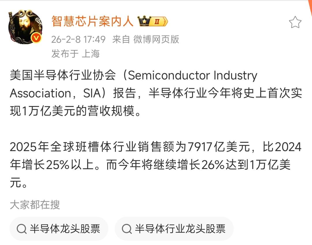 半导体也太猛了吧,1万亿的营收史上第一次,感觉今年还得水涨船高。