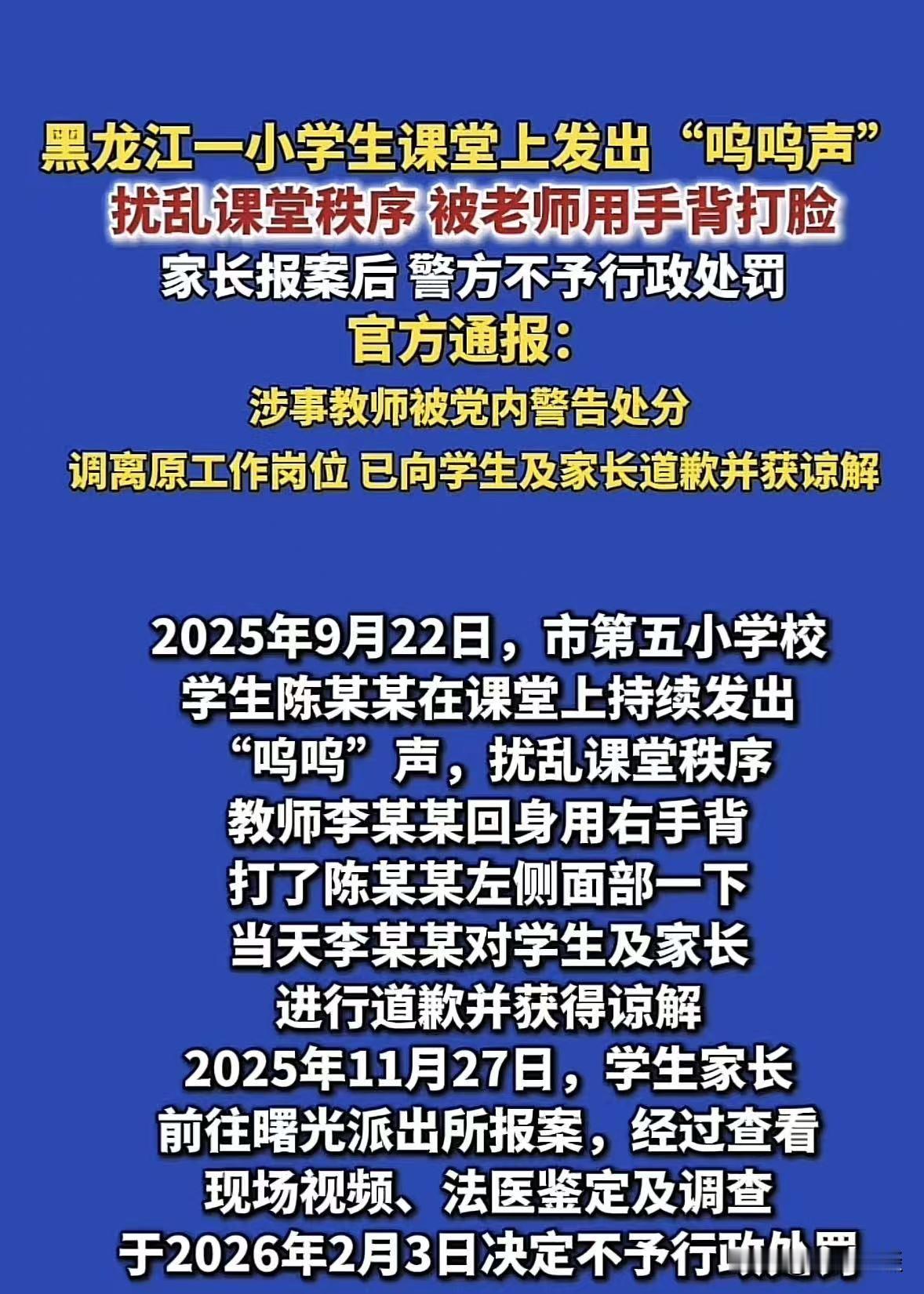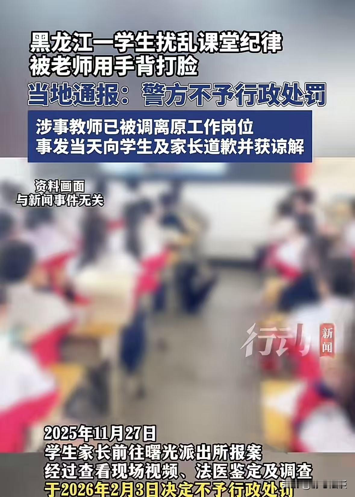 有什么样的家长,就有什么样的孩子!黑龙江虎林,一名小学老师上课期间,有名学生持续发出声音,严重影响课堂秩序,老师忍无可忍,回身用手打了一下学生的脸,事后老师觉得后悔,跟学生及家长进行道歉,并获得谅解,谁也没想到家长气不过,又报了警,但经过调查,决定不予行证处罚,但是对老师进行警告处分,并调离原工作岗位,对此结果,家长不服,向法院提起诉讼,网友:子不教父之过,教不严,师之惰,小时候我妈常跟老师说不听话你就揍,后来老师打了我,我爸妈说这个老师对你负责任,现在我也做了老师! 一堂再普通不过的小学课堂上,李老师在讲课的时候。 有个学生一直在那发出各种呜呜的声音,反反复复,没完没了。 本来安安静静的课堂,被他一个人搅得乱七八糟,别的同学根本没法听课,李老师也没法正常上课。 一开始,李老师是提出警告,可这同学就是不听。 你说你的,他闹他的,完全不把课堂纪律当回事。 李老师站在讲台上,面对几十个孩子,被一个人这么折腾,耐心也被磨没。 实在是忍无可忍,一着急一回身,抬手就给了孩子左脸脸上打了一下。 其实这一下肯定不是往死里打,就是气急了、想镇住场面的一时冲动。 事后,李老师冷静下来,越想越后悔,觉得自己不该动手,方式确实不对。 于是主动找孩子道歉,又专门跟家长沟通,态度特别诚恳,也承认自己情绪失控、做法不妥。 家长当时也表示理解,知道是孩子先捣乱课堂,李老师不是故意的,也就谅解了老师。 事情过去好几天后,谁也没料到,家长嘴上说谅解,心里那口气还是没下去,越想越觉得委屈: 我家孩子再不对,你老师也不能动手打,越想越气,最后直接选择了报警,要给孩子讨要个说法。 《未成年人保护法》第27条:学校、幼儿园的教职员工应当尊重未成年人人格尊严,不得对未成年人实施体罚、变相体罚或者其他呜辱人格尊严的行为。 《治安管理处罚法》第19条:情节特别轻微、主动消除或减轻违法后果、取得被侵害人谅解的,可减轻或不予处罚。 事情已经过去了好几天,警方经过鉴定和调查,认定李老师的行为,还没有达到要行政处罚的程度,所以给出不予行政处罚的决定。 同时学校及相关部门,也按规定做了处理: 老师动手打学生,不管什么原因,都违反了师德要求,触碰了红线。 所以给了李老师警告处分,并且把李老师调离了原来的工作岗位。 对于这个结果,大家以为这事就到此结束了。 可学生家长不干了,觉得处理得太轻,不足以惩罚老师。 于是一纸诉状,直接向法院提起了诉讼。 李老师知道家长要告自己,又后悔又委屈,他打了学生确实不对,自己也接受处罚。 刚开始道歉,已经得到谅解,现在又一直追究没完,他也不知道怎么办才好。 他没想到自己的意思冲动,会把事情闹得这么大! 消息一传到网上,网友们直接炸了锅,评论区吵得热火朝天。 很多人都说出了心里话:子不教父之过,教不严,师之惰。 不少人都回忆起自己小时候,那时候家长送孩子上学,拉着老师的手就一句话: 孩子不听话,你该管就管,实在不行该揍就揍。 那时候老师打了、骂了、罚站了,孩子回家不敢说,说了爸妈还得再教育一顿: 老师管你是对你负责任,不管你才是害你! 但是不管怎么说,客观的讲,老师动手,肯定不对,何况是打了脸。 现在的规矩就是不能体罚学生,不管多生气,都不能动手,这是底线。 但反过来,孩子一直在课堂上乱出声、严重影响别人,难道就对吗? 家长在家有没有教过孩子守规矩、尊重课堂和尊重老师。 时代在变,不能再像以前那样随便打孩子,这是进步,我们都认同。 但进步不等于放任,不等于孩子可以在课堂上肆无忌惮,不等于老师连正常管教都不敢做。 其实最让人无奈的是,以前是求着老师管,现在是老师一管就急。 以前是孩子有错先骂自己孩子,现在是孩子有错先怪老师。 以前是严师出高徒,现在是老师不敢严。 其实话说回来,管‘是责任,严’是真心,适度‘是底线。 老师不跪着教书,孩子不横着长大,这才是教育该有的样子。 对此,你怎么看这件事? @静心法谈 学法辨是非,慬法不吃亏。