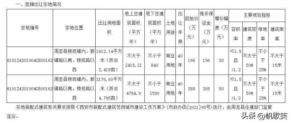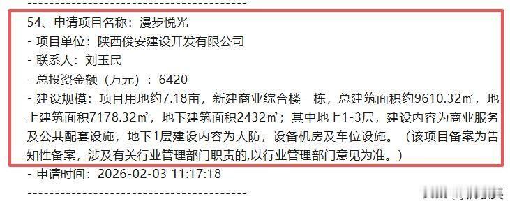 最新!西安这里将增加一个商业项目,案名、规划信息曝光... 近日,西安最新一批批复项目公布,陕西俊安建设开发有限公司打造的“漫步悦光”项目也在其中,引发广泛关注。 批复信息显示:漫步悦光项目的项目单位为陕西俊安建设开发有限公司,总投资金额6420万元! 项目用地约7.18亩,新建商业综合楼一栋,总建筑面积约9610.32㎡,地上建筑面积7178.32㎡,地下建筑面积2432㎡;其中地上1-3层,建设内容为商业服务及公共配套设施,地下1层建设内容为人防,设备机房及车位设施。(该项目备案为告知性备案,涉及有关行业管理部门职责的,以行业管理部门意见为准。) 公开信息显示,漫步悦光项目用地,正是陕西俊安建设开发有限公司近期在陕西省西安市周至县通过竞拍获得两块国有建设用地使用权,地籍编号分别为610124301004GB00162和610124301004GB00163,成交总价584万元。 其中,610124301004GB00162宗地,位于西安市周至县楼观镇范围内,新镇路以南、楼观路以西,净用地面积1612.14平方米(折合2.418亩),为商业用地,地上总建筑面积不大于2418.21㎡,地下总建筑面积不小于840㎡;成交土地总价196万元。 610124301004GB00163宗地,位于西安市周至县楼观镇范围内,新镇路以南、楼观路以西,净用地面积3176.60平方米(折合4.765亩),为商业用地,地上总建筑面积不大于4764.9㎡,地下总建筑面积不小于1590㎡;成交土地总价388万元。 从区位上看,“漫步悦光”项目占据得天独厚的地理位置。它紧邻楼观新镇小学和西安建筑科技大学华清学院楼观校区,学术氛围浓厚,为项目带来了稳定的人流和消费潜力。同时,项目周围分布着楼观新镇福园、楼观新镇财园、楼观新镇禧园、楼观新镇和园、禄园等众多小区,居民密集,对商业服务和公共配套设施的需求旺盛。 “漫步悦光”项目的建设意义重大。其商业服务及公共配套设施的完善,将为周围学生和市民群众提供极大的便利。此外,项目配备的车位设施,也将有效缓解周边停车难的问题,进一步优化区域交通环境。