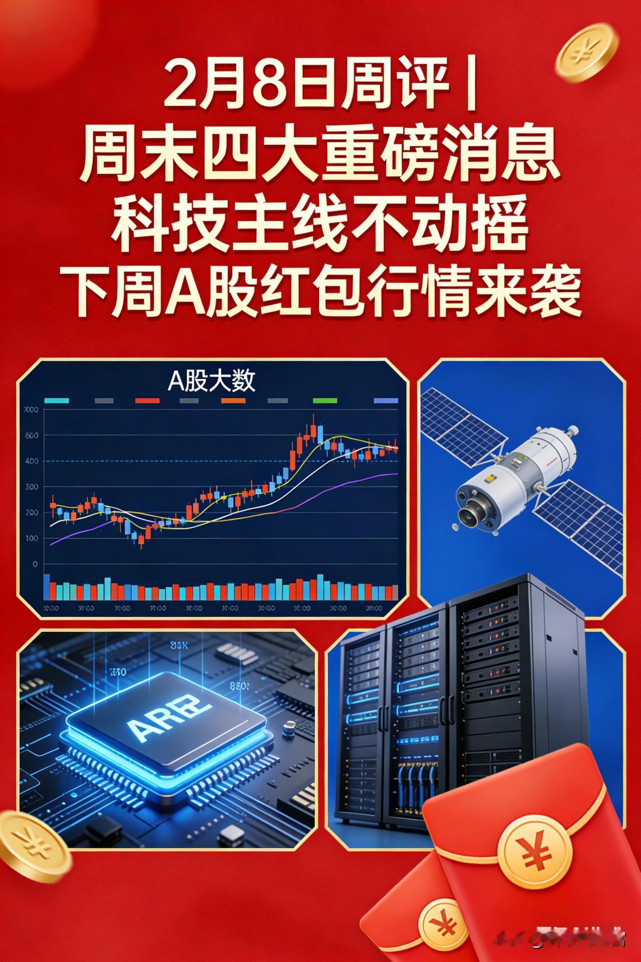 周末四大重磅消息落地!科技主线不动摇,下周A股红包行情稳了 2月8日周末消息面全面偏向积极,四大核心资讯直指科技赛道,从商业航天、算力基建到海外市场、AI应用全线飘红,为A股节前行情定下科技为主、震荡上行的基调。对于股民而言,抓准主线、规避风险,就是节前吃肉的关键,这份全维度解读,直接点明操作方向与避雷要点。 一、商业航天+太空光伏双轮驱动,利好落地但切勿追高 周末科技前沿赛道再传大动作:SpaceX开启工程师招聘,全力推进人工智能卫星与太空数据中心研发;特斯拉同步放大招,计划扩产太阳能电池制造,立下三年实现年100吉瓦太阳能制造能力的目标。 两大海外巨头的动作,直接引爆国内商业航天、太空光伏两大细分赛道,对A股相关产业链形成明确利好。但从市场实操来看,该板块此前已经走出一波趋势行情,整体位置偏高,前期涨幅巨大的高位标,直接列入规避清单。 操作上,放弃高位抱团股,聚焦低位细分龙头才是安全选择;而传统光伏板块短期累计涨幅过大,资金获利盘丰厚,即便有消息催化,也坚决不建议追涨,只关注超跌反弹的低吸机会。 二、算力基建再迎政策加码,短线利好但预期有限 算力作为数字经济的核心底座,周末迎来重磅政策推进:国家将开展算力互联互通节点建设,全面提升整体算力水平,夯实国内算力网络基础。 政策面的加持,对算力板块构成直接短线利好,但结合市场走势来看,算力板块在2025年已经经历全年大涨,板块估值与股价均处于相对高位,资金的炒作预期已经充分兑现。此次政策利好更多是脉冲式行情,反弹力度有限,难以走出持续主升浪。 策略上,算力板块只做反弹不追高,借助消息冲高做高抛,不盲目持仓博弈长期行情,聚焦低位补涨标的即可。 三、美股全线大涨,科技股成领头羊,引爆A股硬科技预期 周五海外市场迎来大爆发,美股三大指数集体走强:道指大涨2.47%,纳指涨2.18%,标普500指数上涨1.97%,科技板块成为上涨核心主力。 美股科技股的集体走强,对A股形成直接的情绪与资金传导,利好直接指向A股科技股,尤其是AI硬件、芯片半导体方向。作为科技赛道的核心硬资产,芯片半导体不仅受益于海外科技行情带动,同时叠加国内自主化替代逻辑,是下周科技主线中确定性最强、资金认可度最高的方向,也是重点布局的核心分支。 四、AI应用持续爆发,节前反复行情可期 AI应用赛道周末消息不断,商业化落地与技术更新双管齐下:阿里千问APP推出“春节30亿免单”活动,免单卡延期后,9小时订单量突破1000万,商业化变现能力持续验证;字节跳动旗下多模态模型Seedance2.0重磅更新,跻身全球第一梯队视频生成模型,技术实力再上新台阶。 从行业逻辑来看,AI应用的爆发完全符合市场预期,经过前期调整后,板块估值回归合理区间,叠加春节前的消费、娱乐场景催化,AI应用板块还有反复活跃的机会。 和前两个赛道一致,AI应用同样要规避高位标的,那些股价处于低位、业绩与技术落地双兑现的细分龙头,大概率迎来第二波行情,是资金博弈的核心方向。 总结:下周红包行情开启,科技主线坚定不移 综合周末四大消息,无论是海外科技巨头布局、政策基建加码,还是美股带动、国内AI应用落地,所有利好均指向科技赛道,下周A股节前红包行情已经板上钉钉,核心主线就是科技,绝不动摇。 实操核心口诀:弃高位、抓低位,守科技、不追涨! 商业航天、太空光伏看低位细分;算力看脉冲反弹;芯片半导体、AI硬件抓主线确定性;AI应用博弈节前反复第二波。