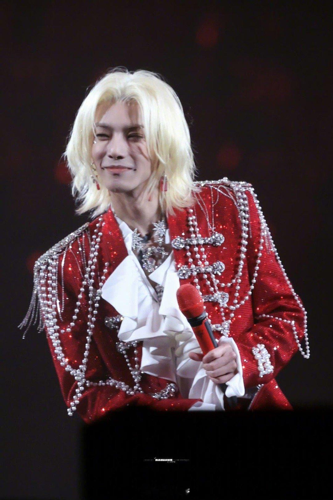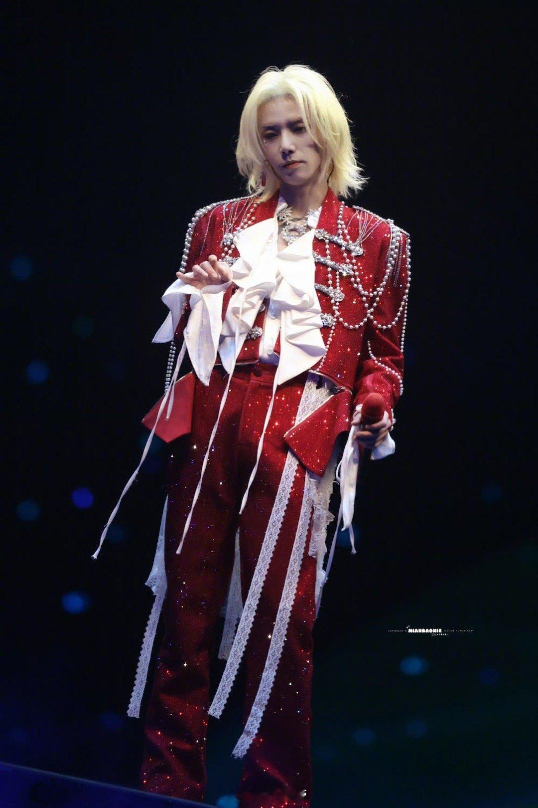 华晨宇星芒红宝石 华晨宇这身星芒红宝石造型太耀眼了!红色亮片西装在舞台上熠熠生辉,珍珠与碎钻的点缀更添奢华质感,白金狼尾发型则注入不羁灵魂。每一个转身都带起一片星光,这才是顶级舞台表现力!