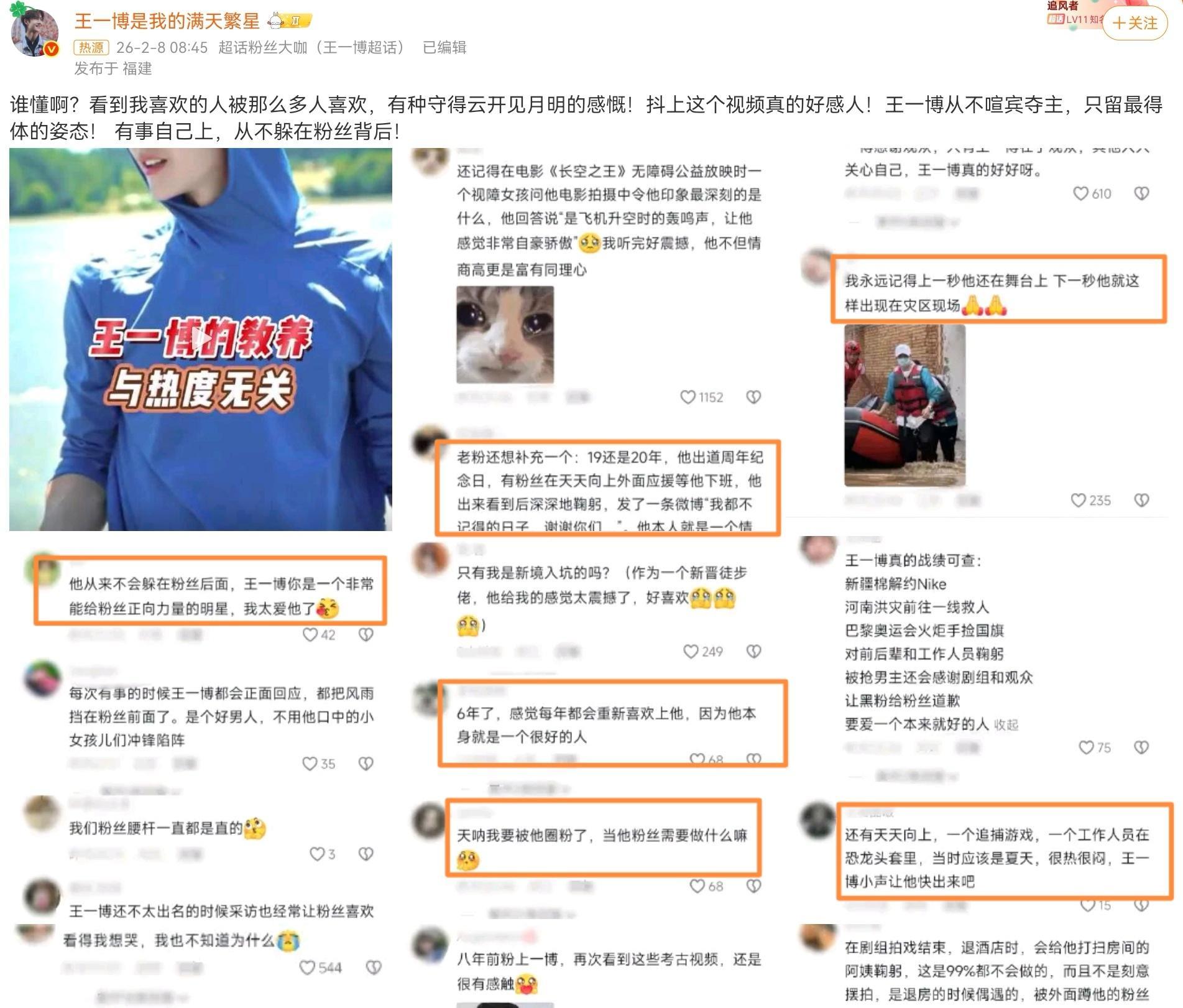 在配图中,看到很多网友的流言,有分享过往暖心事儿的,有被王一博迅速吸粉的,更多的是,为喜欢王一博而自豪的言语,永远站在粉丝身前、有话自己会说,并且在人品、作品都做到极致的王一博,就是她们最大的底气!不论是追星也好,还是追作品也罢,我们要追的,就该是王一博这样的!
