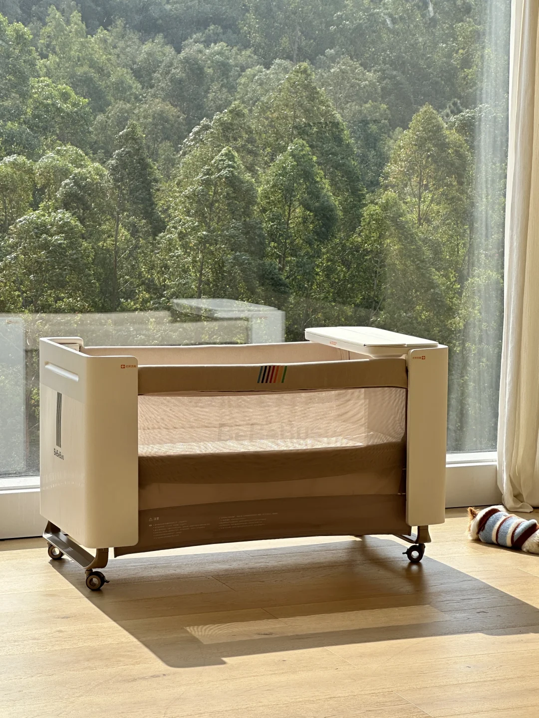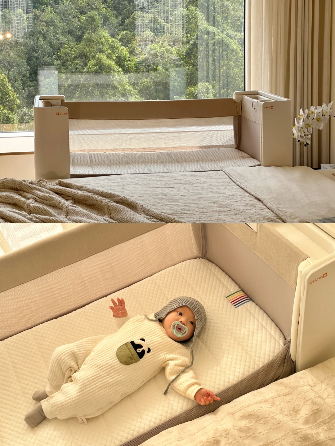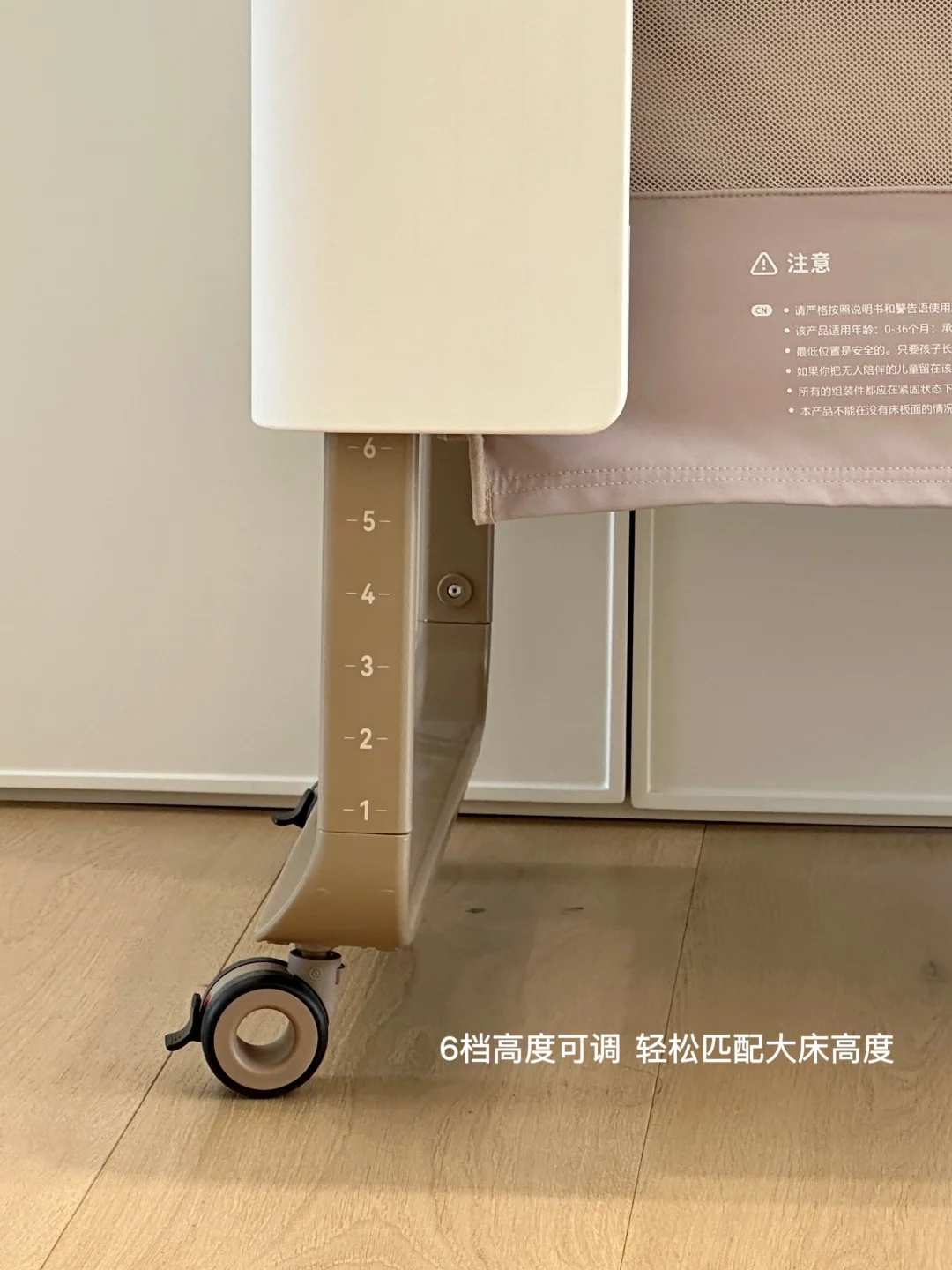 白天放客厅窗边,宝宝躺晒着太阳,咿咿呀呀的超乖~夜里挪到主卧床边,6档高度调得和大床齐平,喂奶不用起身,也不用担心翻身压到他。