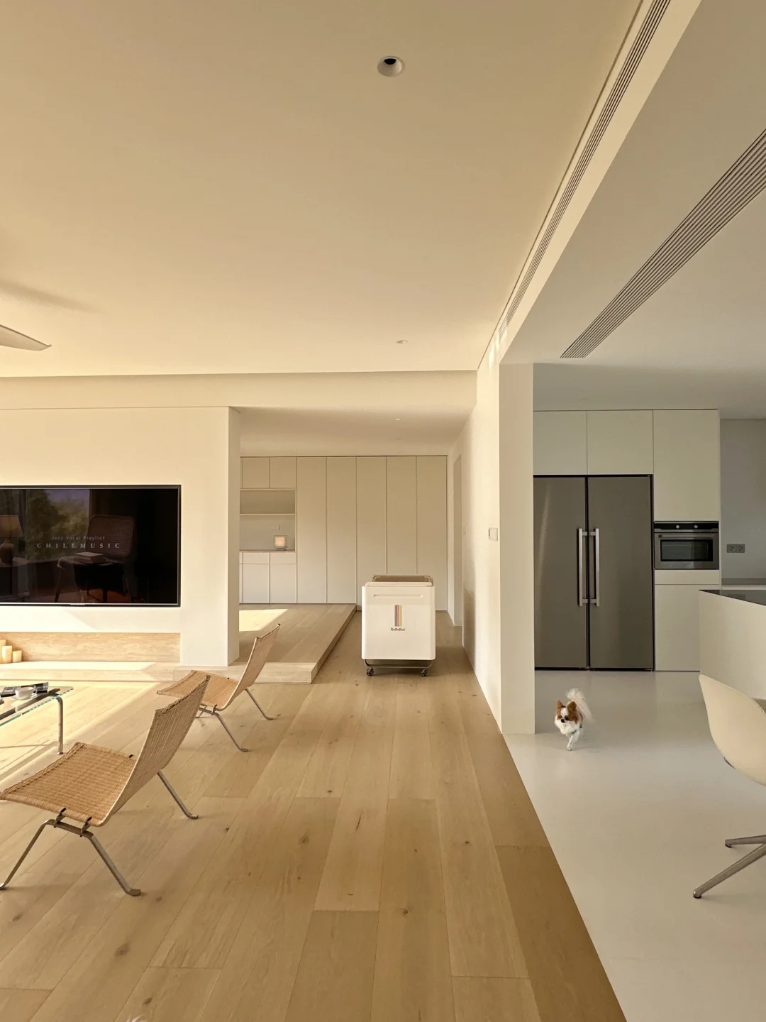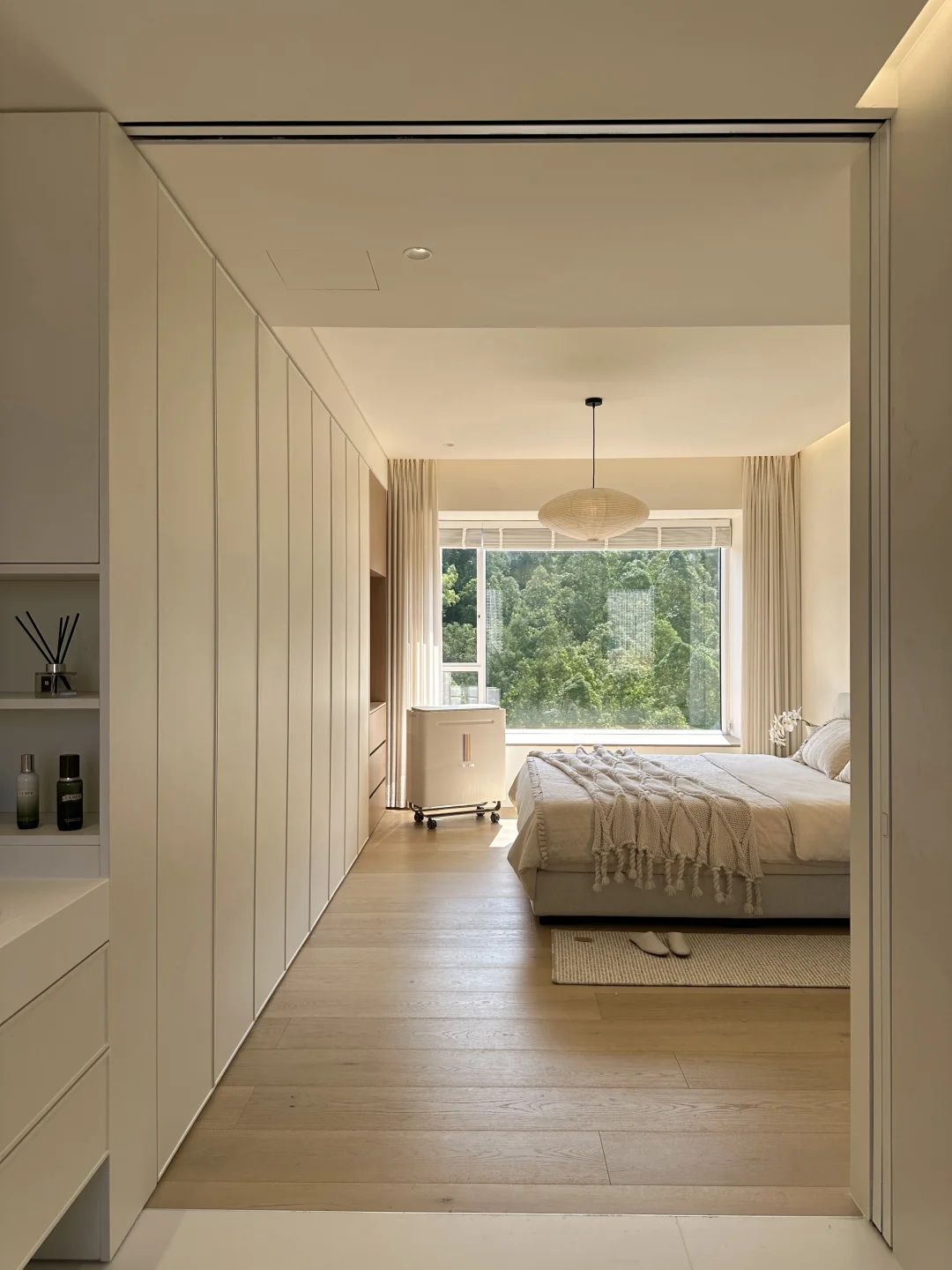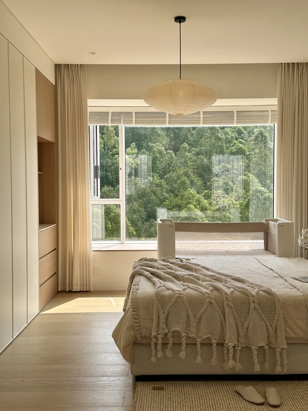没有复杂的装饰,白墙和木地板打底,搭配简约线条的家具,让树景成为家里最灵动的软装。一抬头就是窗外的青山树影,松弛感拉满~