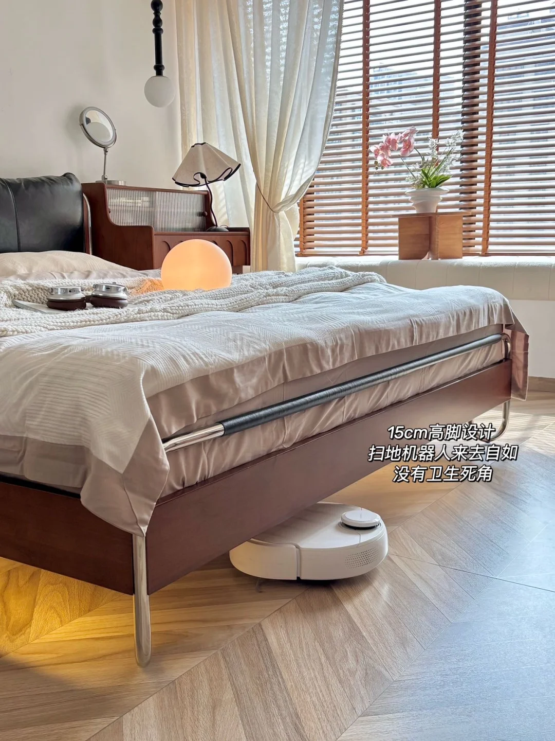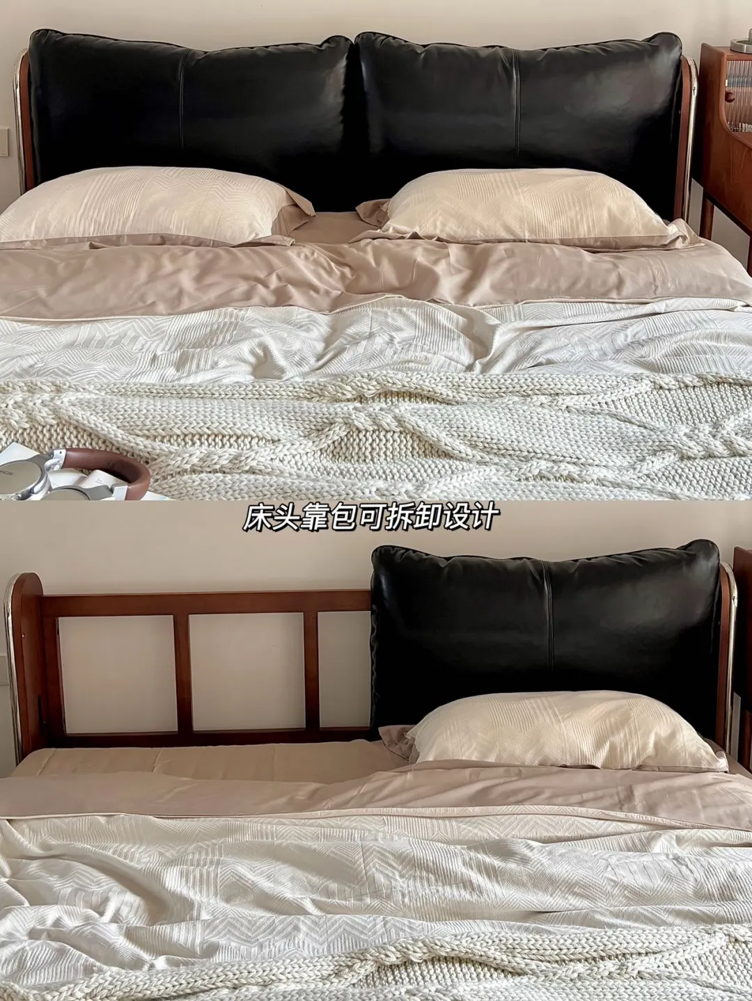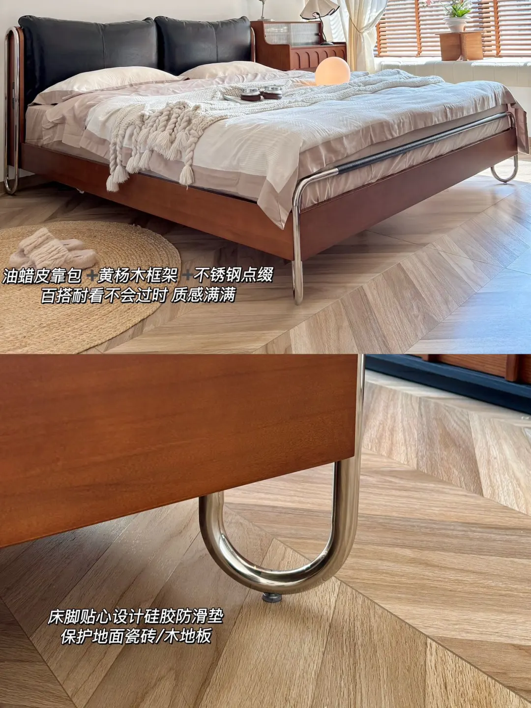 油蜡皮靠包、黄杨木框架搭配利落不锈钢线条 撑起整个中古风卧室的灵魂! - 黑色油蜡靠包饱满有质感 羽绒、羽丝棉与高回弹海绵三重填充 倚靠柔软又有支撑,靠包可拆卸设计 日常打理更省心。搭配加密榉木排骨架 床体稳固不晃,睡感安心又踏实✨ - 流影床体利落不占地,床尾摆放梳妆台后 过道依旧宽敞自在 15cm 高脚设计,让扫地机器人自由进出 轻松告别床底卫生死角~ - 床头自带触控小夜灯,轻触即亮 长按可调亮度,深夜起夜更贴心 侧边 USB 充电口,躺卧追剧随手补电 日常幸福感直接拉满! - 中古风的高级感从不是堆砌,轻硬装打底 选对一张点睛之床 再用黑、棕、白软装慢慢搭配 就能拥有一间耐看又治愈的中古卧室 感谢博主的装修日记 的体验分享