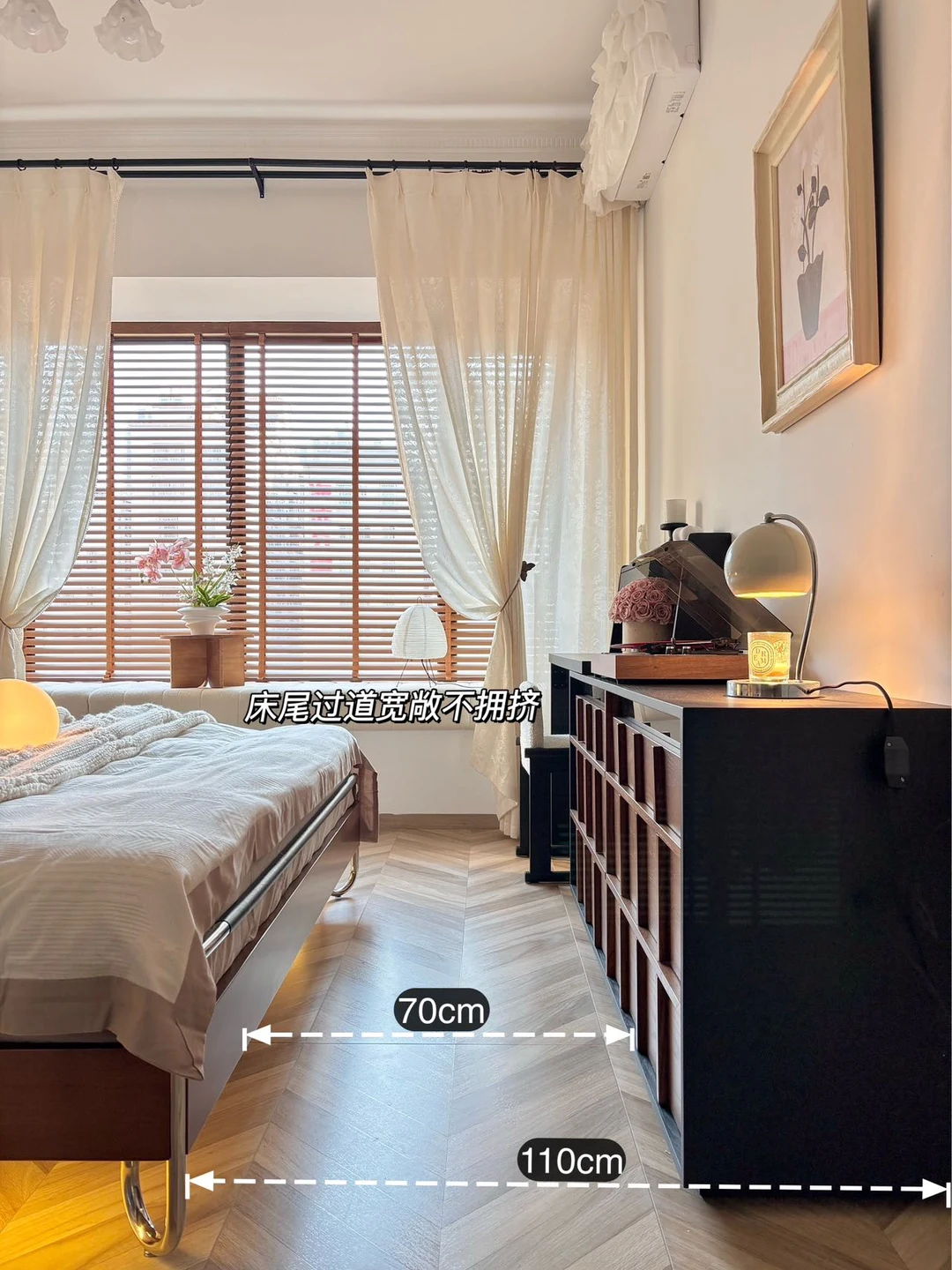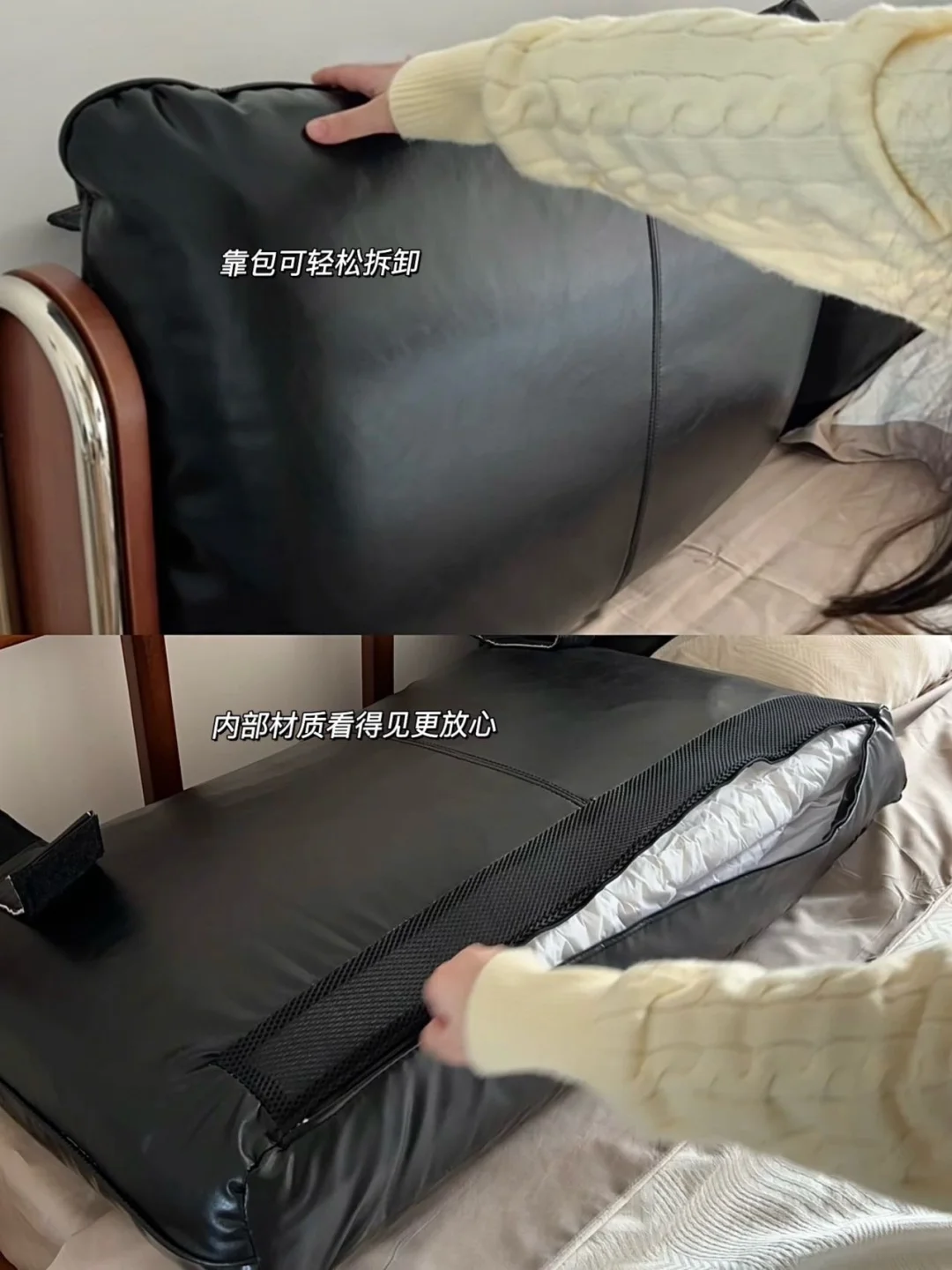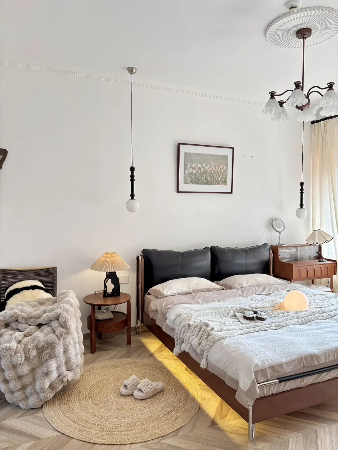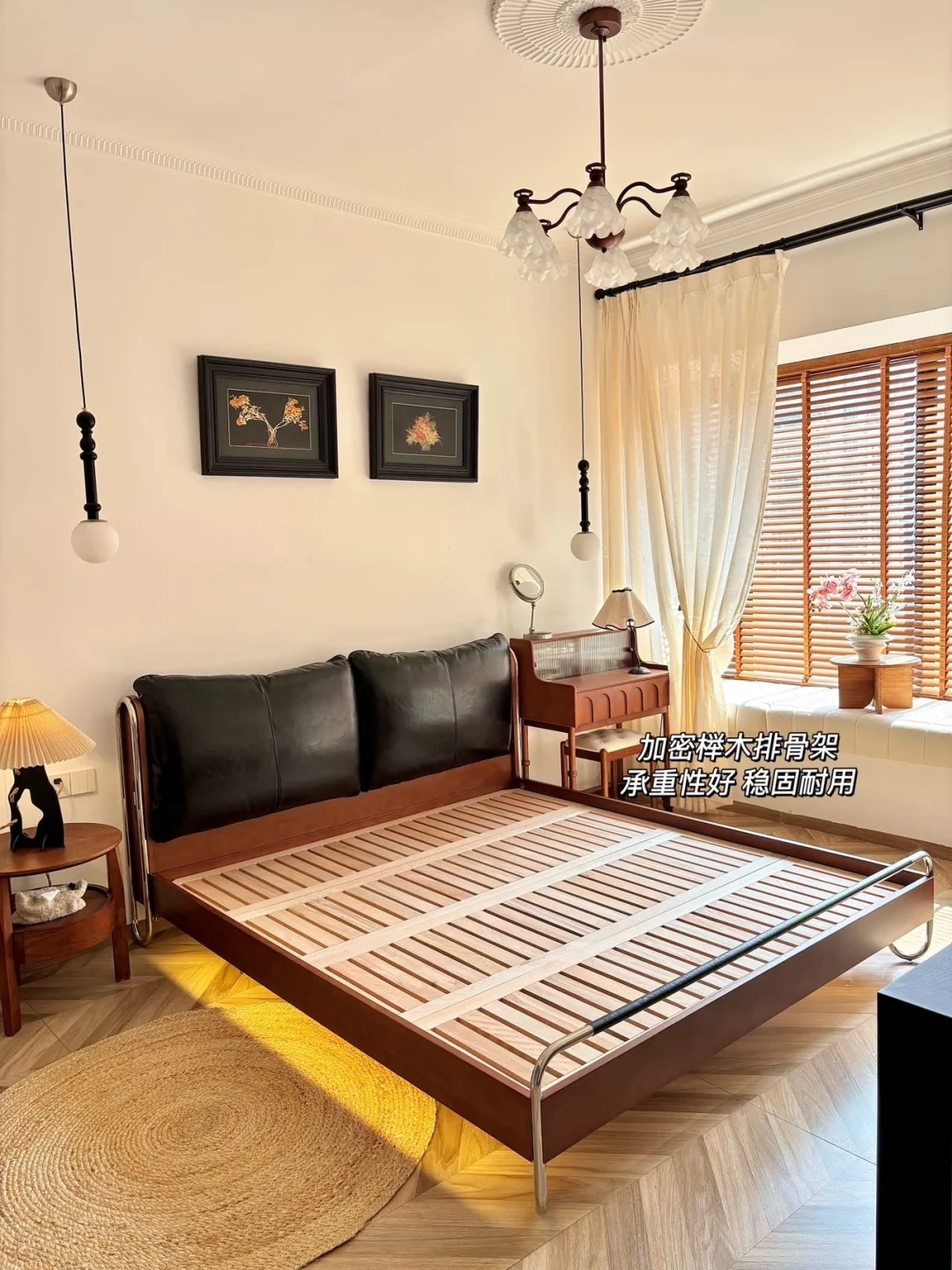 油蜡皮靠包、黄杨木框架搭配利落不锈钢线条 撑起整个中古风卧室的灵魂! - 黑色油蜡靠包饱满有质感 羽绒、羽丝棉与高回弹海绵三重填充 倚靠柔软又有支撑,靠包可拆卸设计 日常打理更省心。搭配加密榉木排骨架 床体稳固不晃,睡感安心又踏实✨ - 流影床体利落不占地,床尾摆放梳妆台后 过道依旧宽敞自在 15cm 高脚设计,让扫地机器人自由进出 轻松告别床底卫生死角~ - 床头自带触控小夜灯,轻触即亮 长按可调亮度,深夜起夜更贴心 侧边 USB 充电口,躺卧追剧随手补电 日常幸福感直接拉满! - 中古风的高级感从不是堆砌,轻硬装打底 选对一张点睛之床 再用黑、棕、白软装慢慢搭配 就能拥有一间耐看又治愈的中古卧室 感谢博主的装修日记 的体验分享