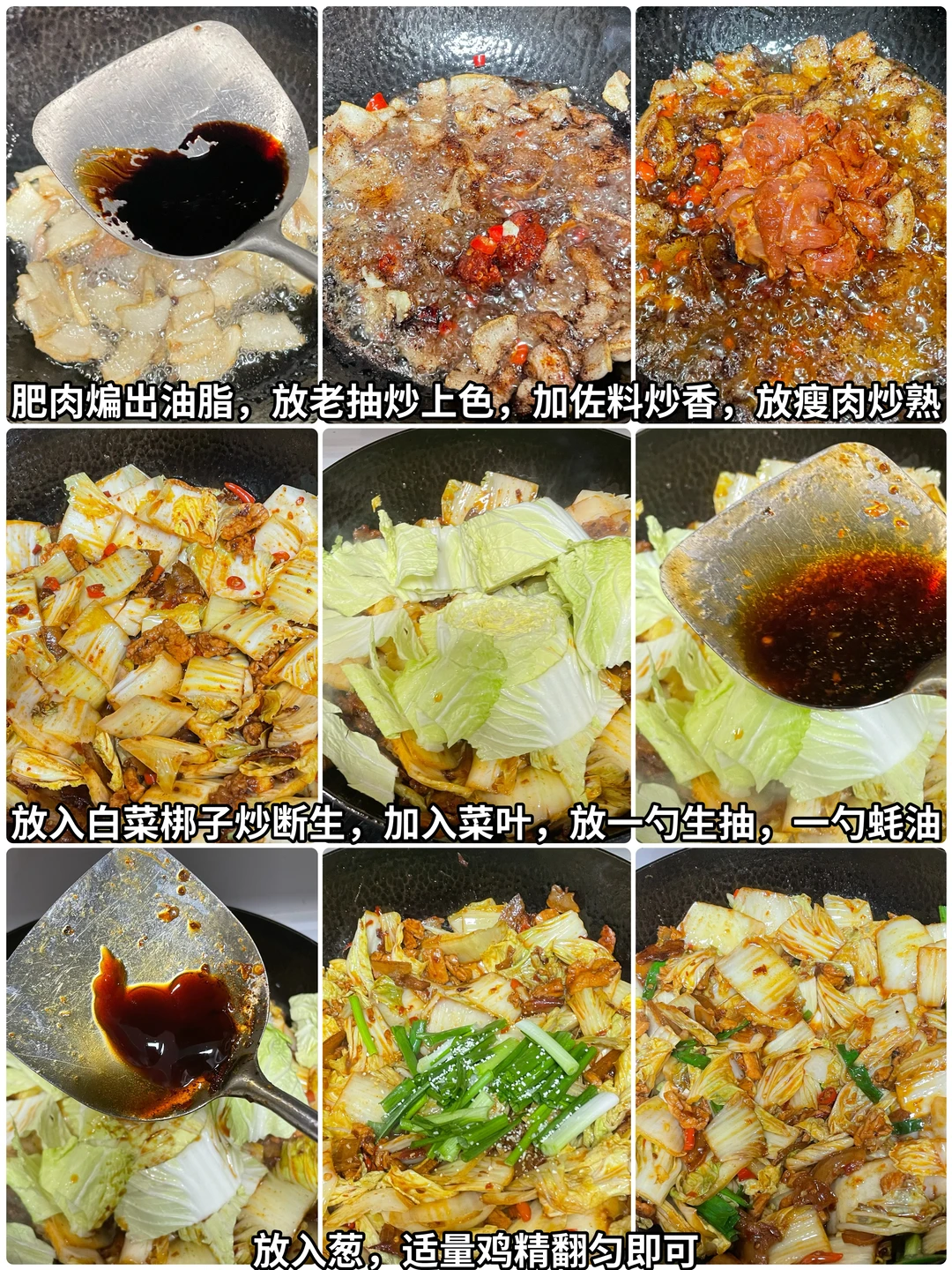 姐妹们,今天给大家出一个白菜炒肉,家常又下饭。喜欢的姐妹可以尝试一下。 🌶️食材:白菜,梅花肉 👩‍🍳做法: 1⃣️肥肉切片,瘦肉切片放入。豆瓣,胡椒粉。生抽。淀粉。抓匀腌制10分钟备用, 2⃣️白菜切块儿,葱切段,再准备一些小米辣蒜和一勺糍粑辣椒。 3⃣️起锅烧油,油热将肥肉放入锅中,加几粒花椒煸炒出油脂。放入老抽炒上色,加入蒜、小米辣糍粑、辣椒炒香,再放入瘦肉炒熟,加入白菜帮子炒断生,放入白菜叶翻匀,加入1勺生抽,1勺蚝油。炒熟之后放入葱,适量的鸡精翻匀即可出锅,这样做出来的白菜炒肉真的是巨下饭,喜欢的姐妹试试吧。