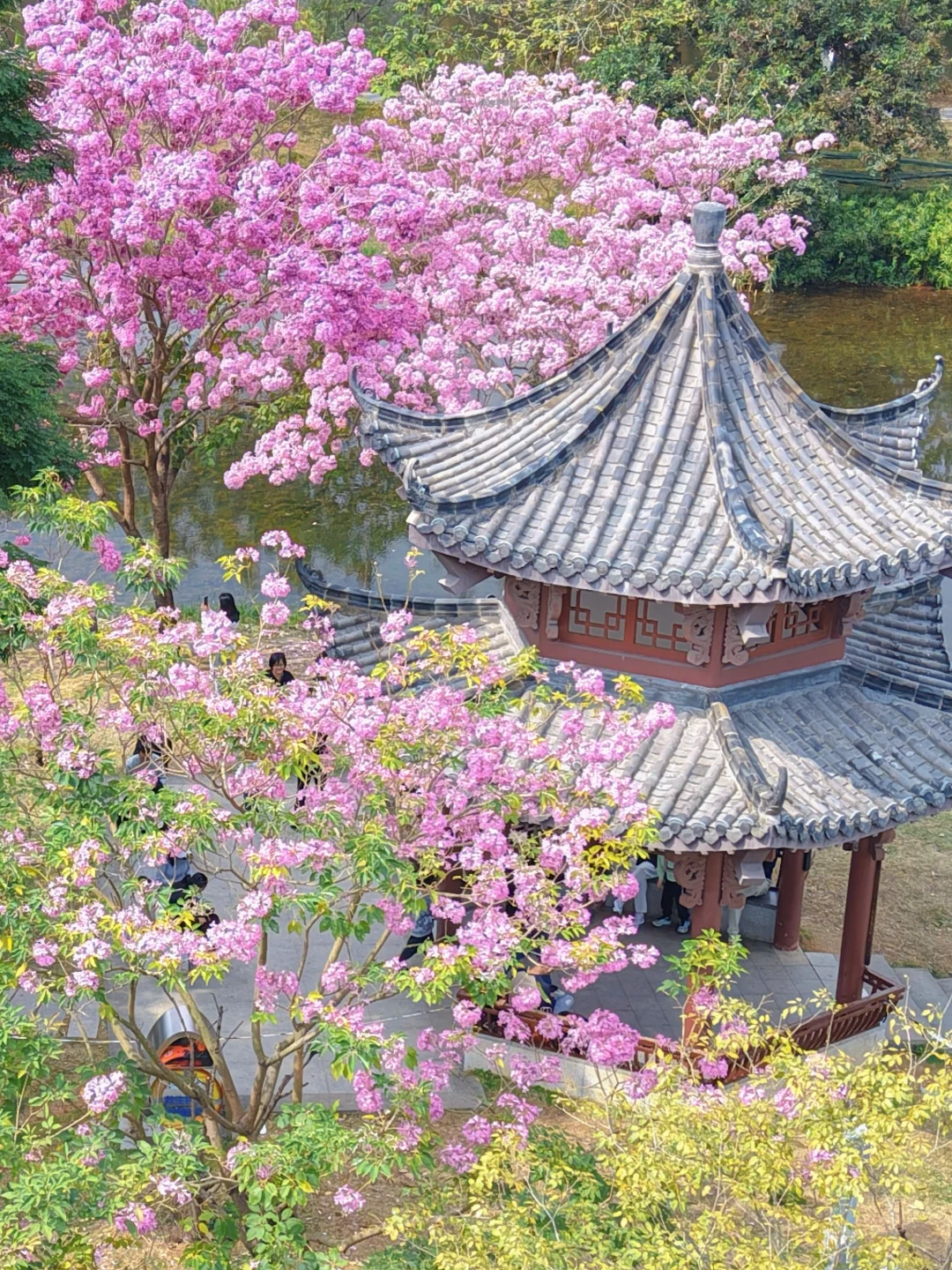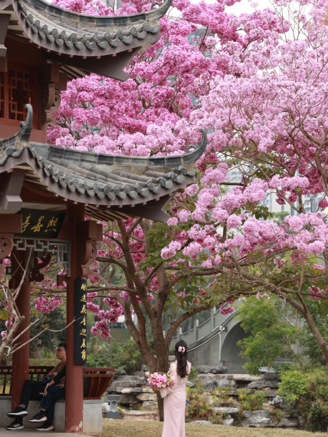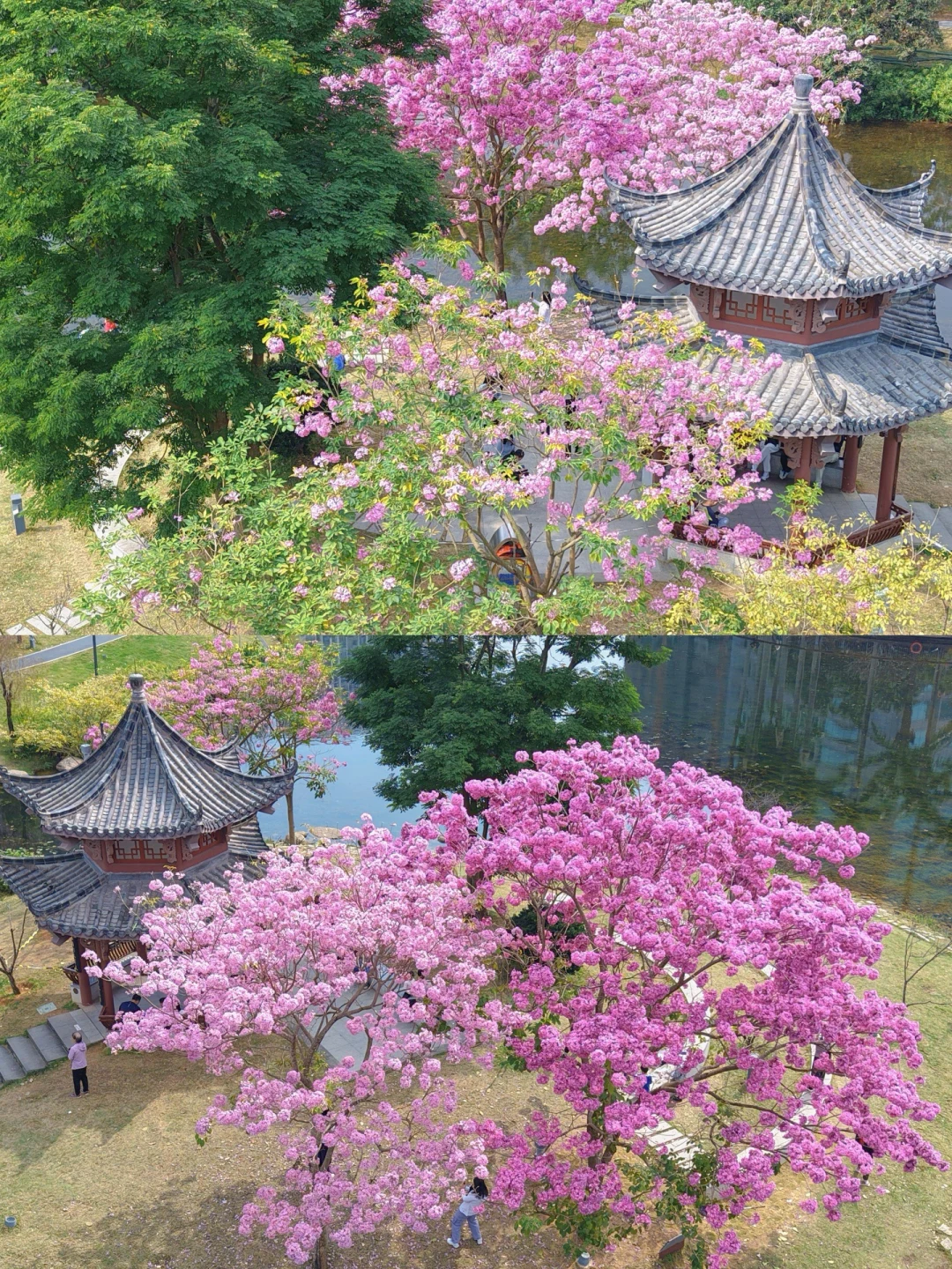 📍:四海公园 交通🚉:四海地铁站A出口,步行🚶900米 🌸紫花风铃木在亭子周围形成一幅古画,永远要相信老祖宗的审美~ 但是只有两三棵树 介意的朋友请犹豫[萌萌哒R][萌萌哒R]