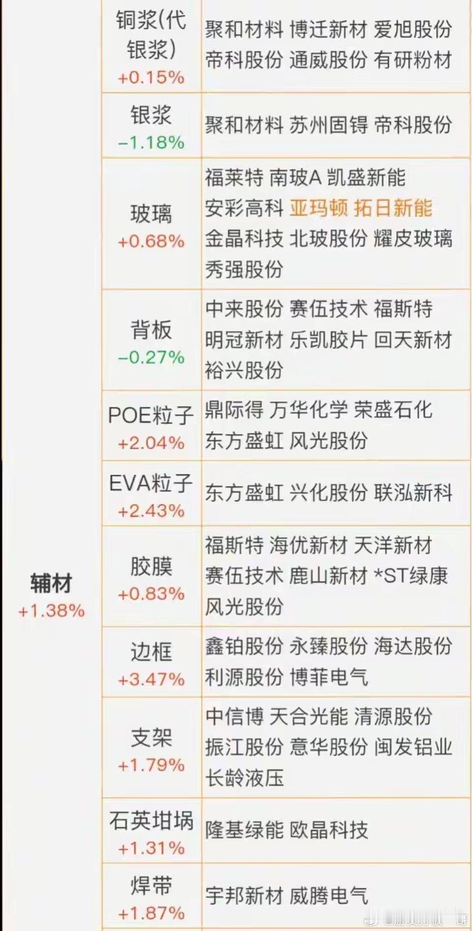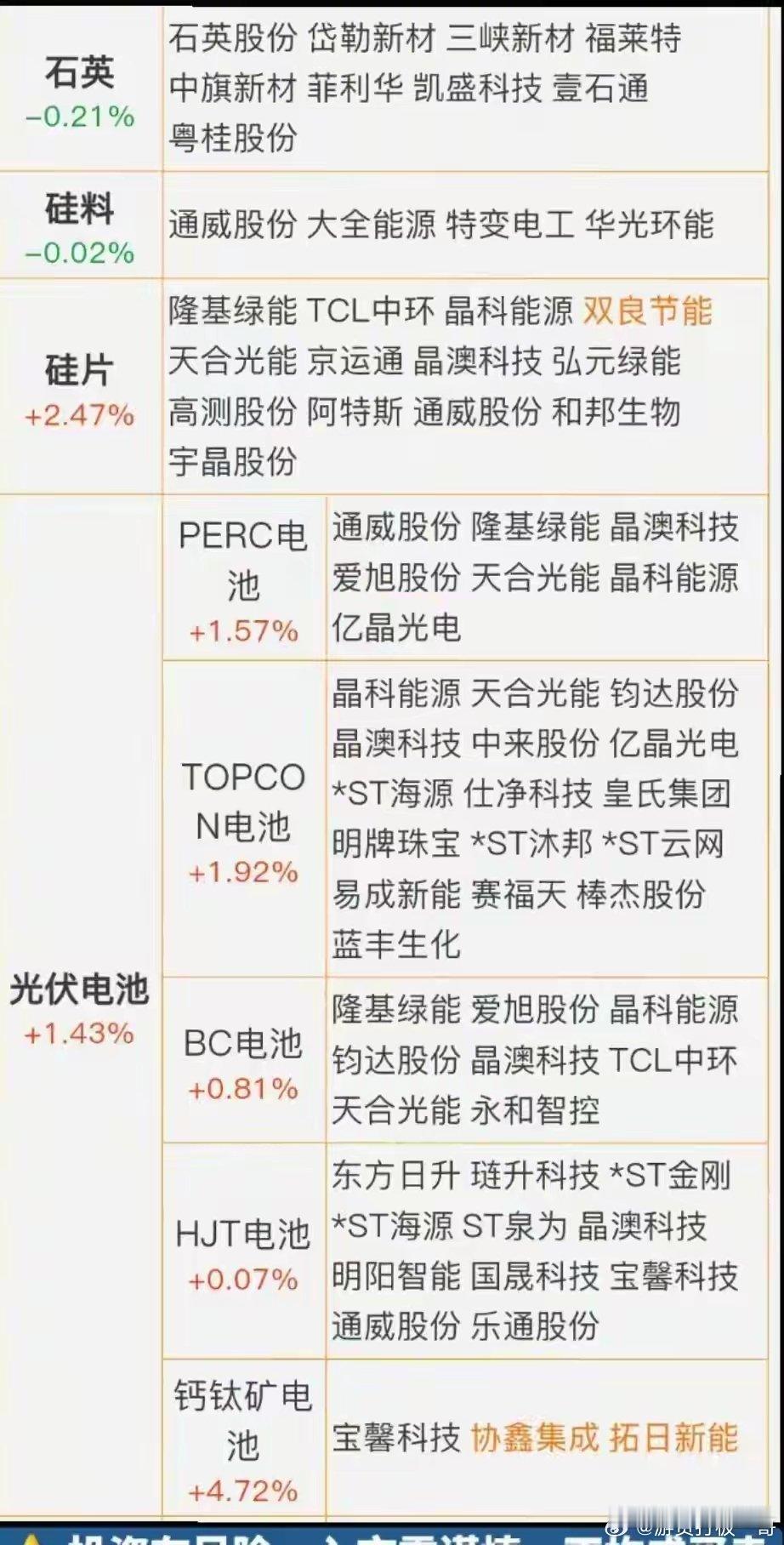 太阳能电池+太空光伏!最正宗8家A股受益公司概念股梳理 最新名单特别声明:只做行业科普不作推荐,不对任何人构成投资建议,资料取材网络仅供参考,不能作为投资依据。理财有风险入市需谨慎!B消息面特斯拉2028年底在美部署100GW本土太阳能产线,异质结、钙钛矿成核心路线;国内政策同步推进“太空光伏”示范,低轨卫星太阳翼需求爆发,电池组件龙头技术储备充足,订单排产至2027年,板块从“周期修复”跃升“太空能源”新主线。B核心概念股梳理分析B1.东方日升太阳能电池:国内唯一量产超薄P型异质结电池,效率领先,产线柔性高,可快速切换太空级抗辐射封装。太空光伏:产品已批量用于低轨卫星太阳翼,成为海外星座项目首选方案,客户验证充分。主营业务:高效光伏电池及组件。核心逻辑:HJT技术壁垒高,太空订单附加值大,客户粘性强,产能释放带动盈利高增,享受量价齐升红利。B2.天合光能太阳能电池:全面布局HJT、砷化镓、钙钛矿叠层技术,电池效率行业领先,工艺平台支持太空级封装。太空光伏:综合技术路线覆盖各类太空环境,产品已批量用于星座太阳翼,客户验证充分。主营业务:光伏电池及系统解决方案。核心逻辑:多技术路线降低单一技术风险,太空封装溢价高,客户粘性强,订单饱满保障长期盈利。B3.晶科能源太阳能电池:N型TOPCon/钙钛矿叠层电池转化效率领先,与晶泰控股共建高通量实验线,快速迭代太空封装。太空光伏:叠层电池已送样星座项目,适配柔性太阳翼,客户验证进展顺利,订单即将放量。主营业务:高效光伏电池及组件。核心逻辑:叠层技术效率天花板高,太空封装溢价显著,实验线加速迭代,订单放量推动业绩高增。B4.协鑫集成太阳能电池:布局异质结与钙钛矿叠层技术,高效电池可向太空光伏轻量化方向迁移,产线改造成本低。太空光伏:叠层电池已送样星座项目,适配柔性太阳翼,客户验证充分,订单即将放量。主营业务:高效光伏电池及组件。核心逻辑:叠层技术领先,太空封装溢价高,产线兼容性强,订单放量推动盈利高增,享受技术升级红利。B5.钧达股份太阳能电池:通过投资星翼芯能切入柔性钙钛矿赛道,绑定中科院团队,快速迭代太空级封装技术。太空光伏:柔性钙钛矿电池已送样星座项目,适配卷曲太阳翼,客户验证进展顺利,订单即将放量。主营业务:光伏电池及股权投资。核心逻辑:股权绑定钙钛矿团队,技术资源稀缺,柔性电池适配太空需求,订单放量推动业绩高增。B6. 上海港湾太阳能电池:子公司伏曦空专注柔性钙钛矿空间能源系统,产品已通过多颗卫星在轨验证,运行稳定。太空光伏:空间能源系统经多星在轨验证,客户覆盖卫星与探测器总体单位,品牌优势显著。主营业务:地基处理及空间能源系统。核心逻辑:深厚航天工程经验转化为能源系统优势,在轨实绩丰富,星座扩容带来持续订单,盈利成长确定性强。B7.帝科股份太阳能电池:HJT低温银浆龙头,导电浆料已用于商业航天卫星太阳翼,适配太空级抗辐射封装。太空光伏:银浆产品已进入卫星太阳翼供应链,客户验证充分,订单持续增长。主营业务:光伏导电浆料及电子元器件材料。核心逻辑:太空级银浆技术壁垒高,客户粘性强,订单放量推动盈利高增,享受材料端长期红利。B8.福斯特太阳能电池:光伏胶膜绝对龙头,高效电池在极端环境稳定工作的“防护服”,产品已批量用于星座太阳翼。太空光伏:特种封装胶膜全球专利授权,抗辐射与耐高低温性能优异,唯一合法供应商。主营业务:光伏封装胶膜及背板。核心逻辑:特种封装材料壁垒高,专利护城河保障溢价,星座建设带动需求,唯一供应商地位确保长期高盈利。最后附上概念最新更新名单。财经观察官