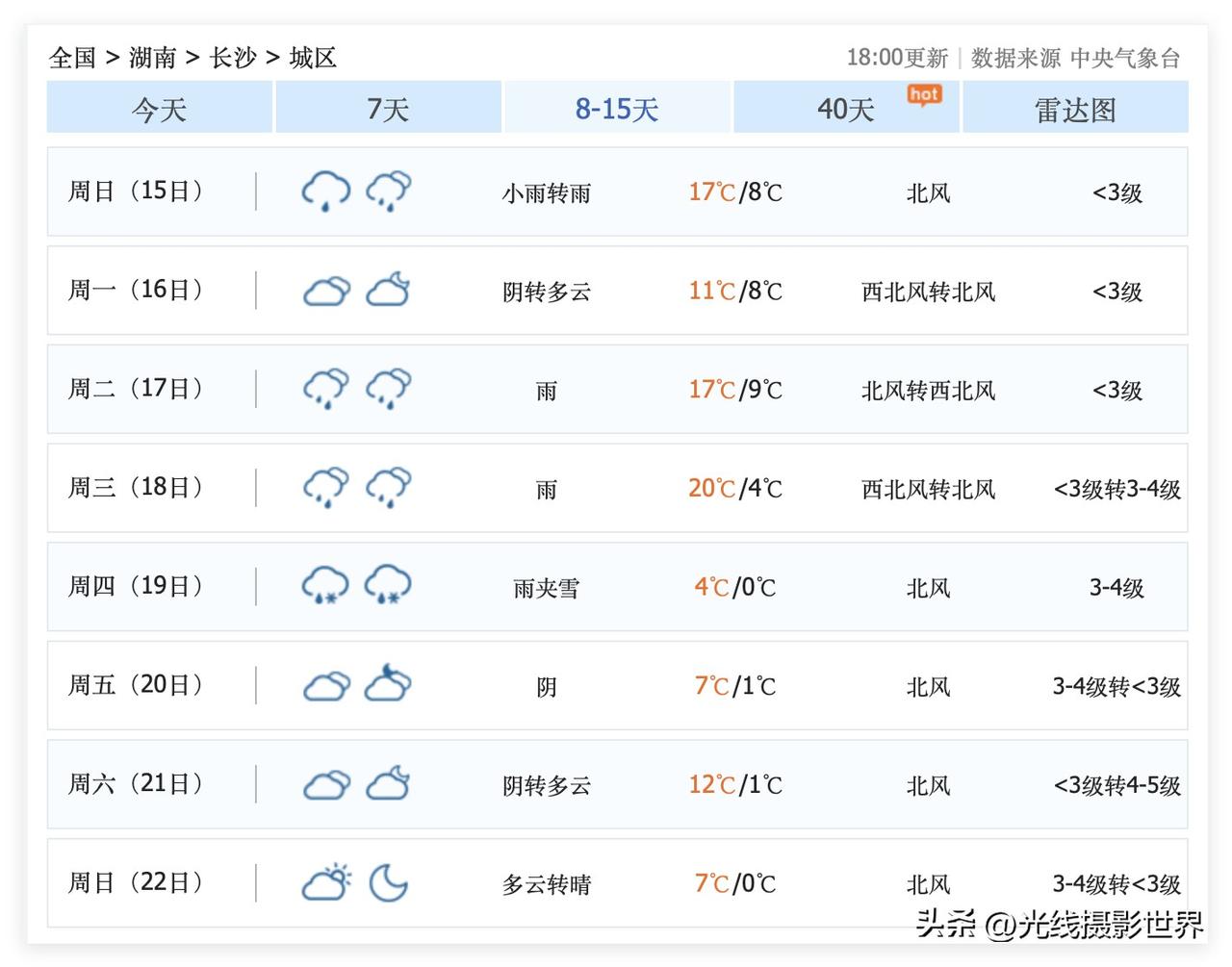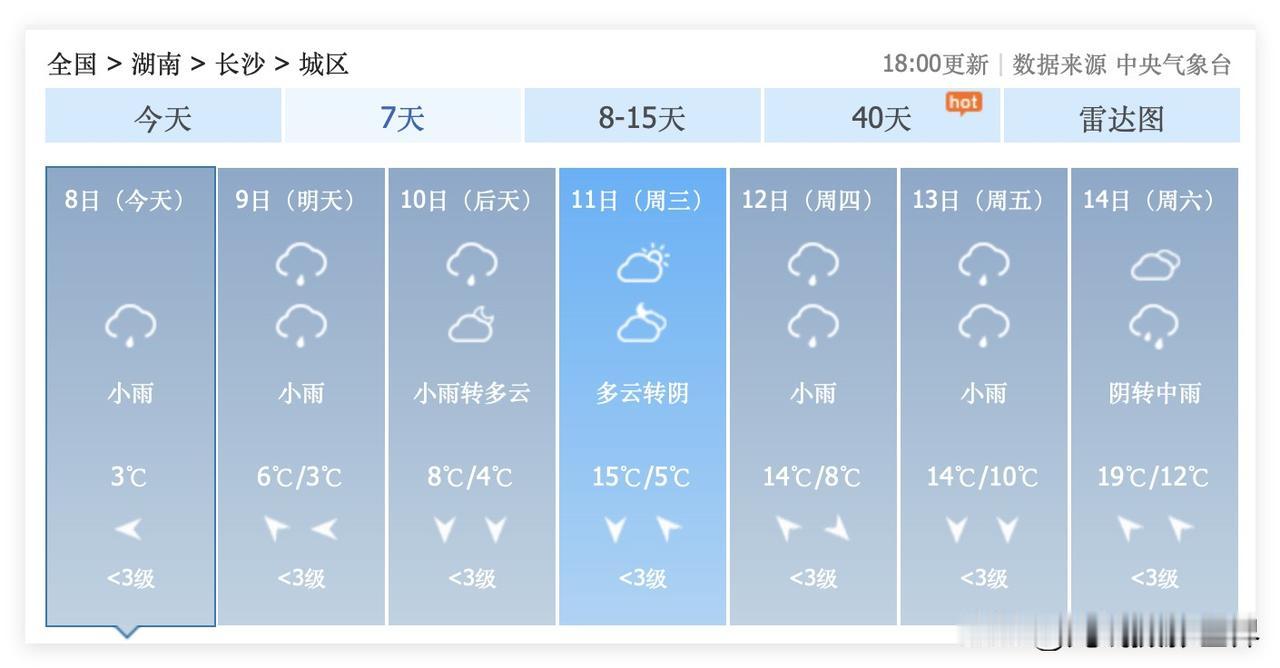 让人又喜又忧啊!2月11日到18日,湖南省长沙市,总体来说,气温回暖,非常温暖,最高气温冲刺20度!但是,问题是,2月11日到20日,长沙市,可能会经常下雨啊! 好吧……2月14日,长沙市,阴转中雨!这是春节春运,自驾车返乡的高峰期的第一天! 2月15日,自驾车返乡的高峰期的第二天……长沙市,小雨转雨……这非常不利于长途自驾车返乡过年啊! 好吧,2月17日到20日,长沙市,阴雨连绵,降雨降温,雨夹雪! 2月19日,长沙雨夹雪,气温暴跌至0-4度。 …… 我的个天啊!看了看长沙天气预报……确实是让人欢喜让人愁啊! 大家觉得呢?! 2月9日到22日的长沙天气预报,看了看,让人……一言难尽啊!
