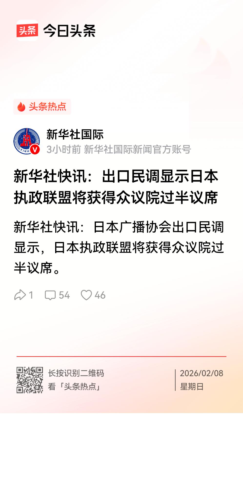 日本选举结果即将出炉,日本执政联盟获得过半数席位,高市继续担任首相(新华社报道见图片)。 有人说,对东亚及世界来说,是一个坏消息。 而我认为,这对咱们来说是个好消息。正像沈逸教授所说的,我们的国运来的时候挡都挡不住。高市只要在她既定的道路上狂奔,我们就可以实现祖国统一的时候,顺便把新仇旧恨一起报了,就能够助力我们的伟大复兴。