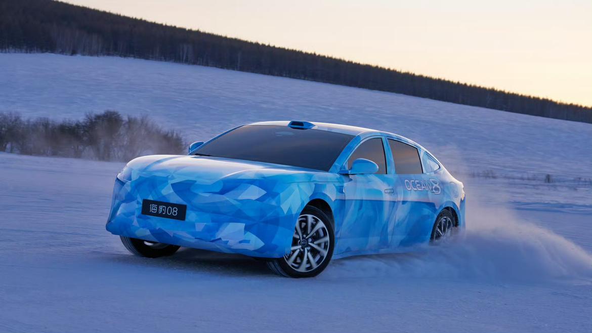 海豹08的官方伪装图放出,冰雪路测场景展示性能亮点。 车身采用低趴溜背轿跑造型,延续Ocean S概念车的设计风格,车顶配备激光雷达模块。 海豹08是海洋网“8系双旗舰”轿车(SUV为海狮08),车长超5.1米,轴距破3米,尺寸超越奔驰E级等传统豪华车型,主攻30万-35万元高端市场。 后轮转向系统:多组路透谍照显示,低速转弯时后轮与前轮反向偏转。 三电系统:基于800V高压平台,支持兆瓦级闪充(5分钟补能400公里),纯电续航或达1000公里;四驱版最大功率480千瓦,零百加速有望低于5秒。 智能驾驶:预计搭载“天神之眼5.0”高阶智驾系统。 新车计划于2026年第一季度正式亮相,竞品锁定特斯拉Model 3、小米SU7等热门电动轿跑。【来自懂车帝车友圈】