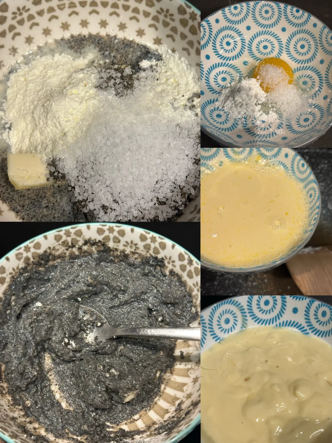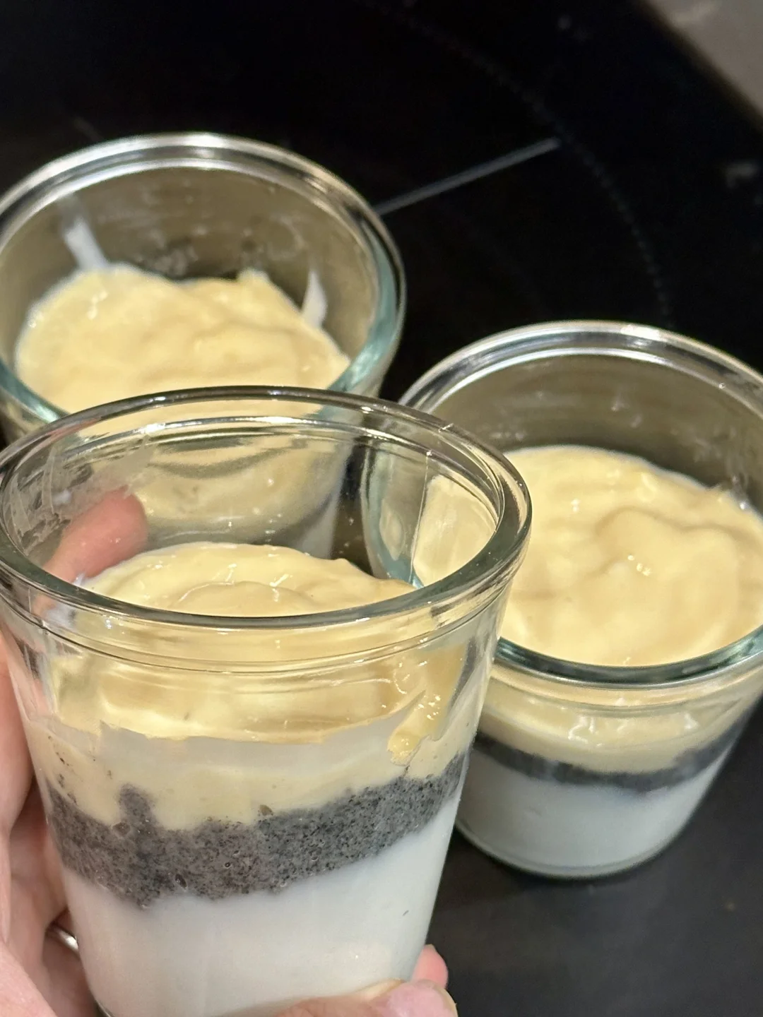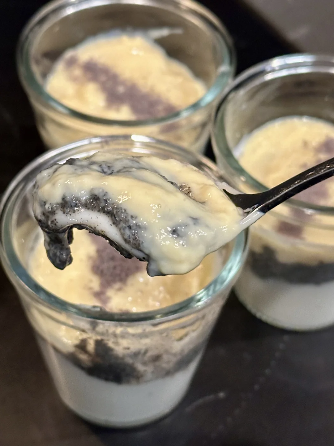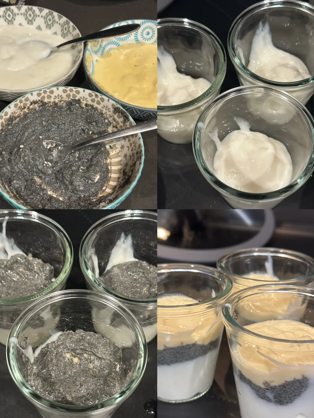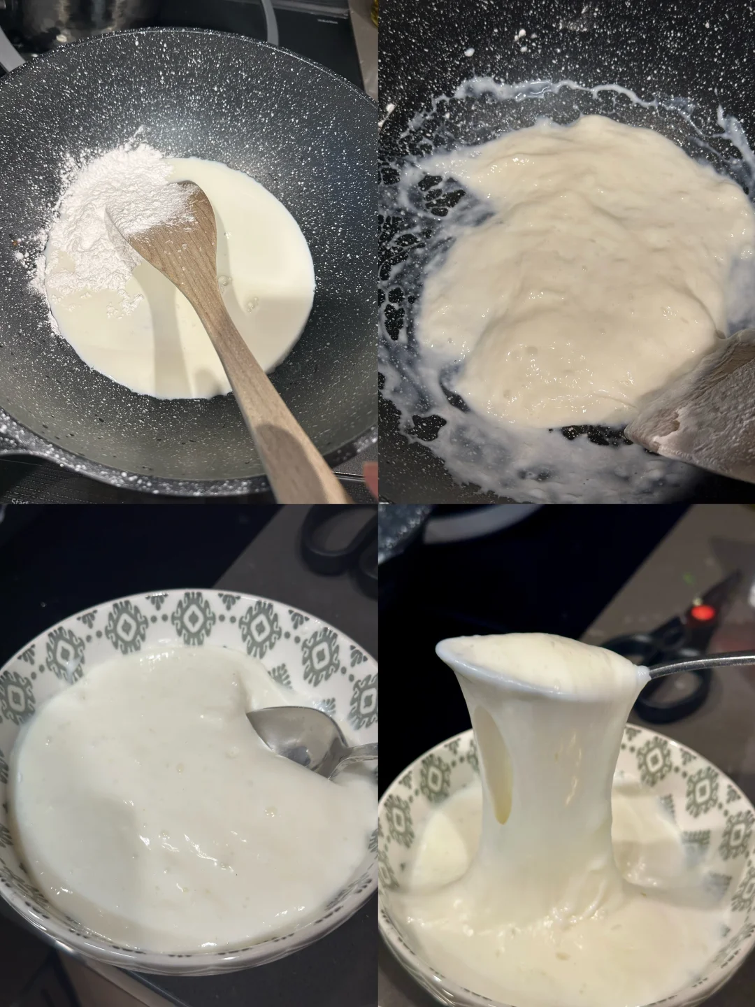 大概是在去年的时候,美国的超市里忽然大量出现了盒马的甜品,我和男友很欣喜地尝试了不少,有的确实很好吃(我说的就是桂花酒酿大福!)。 但很喜欢黑芝麻和麻薯元素的我们,吃到期待最高的黑芝麻豆乳米麻薯,反而感觉差了点意思。黑芝麻做得太苦了,而且可能是冷冻长途运输的原因,麻薯的口感也有点奇怪。 - 于是我就一直惦记着,在这个甜品框架上,自己复刻出味道更好的版本! 新鲜搅打出的奶麻薯,看图片就知道多软糯拉丝了吧!与之形成反差的是豆乳卡仕达,轻盈清甜浓郁的黄豆香。中间的黑芝麻馅儿也不容忽视,味道有点像黑洋酥,但多了点奶香和流动感。 而且这一次我没有用到奶油,糖量也比较克制,可以算是轻盈甚至小小养生的甜品了~ - 🍡鲜奶麻薯 200g纯牛奶,45g木薯粉,15g白糖混合,锅子里小火搅拌,会开始看到底部稍稍凝固,继续搅拌到整体浓稠,可以清晰地用铲子划出痕迹。这时候关火,再继续搅拌两分钟,余温会让它更浓稠一些,然后盛出备用。 🌟记得火开小一点慢慢煮,大火虽然煮得快,但可能奶麻薯会有生粉味 - 🥛豆乳卡仕达 一颗蛋黄,10g白糖,15g玉米淀粉先调匀,再加125g豆奶(推荐我图片里那个,很香),和鲜奶麻薯一样,小火不断搅拌煮到浓稠乳霜状。 🌟建议把这个方子量翻倍,因为味道真的特别好吃!我是因为鸡蛋不够了哈哈 - 🌰黑芝麻奶酱 80g黑芝麻粉,20g奶粉,10g白糖,10g黄油混合,然后缓慢加牛奶,调到湿润微微流动的状态。 - 🍮组装! 奶麻薯打底,加上一层黑芝麻奶酱,再盖上豆乳卡仕达,如果想要卖相好看可以上面再撒点黄豆粉,就完成了! 这个分量可以做三四人份。 -