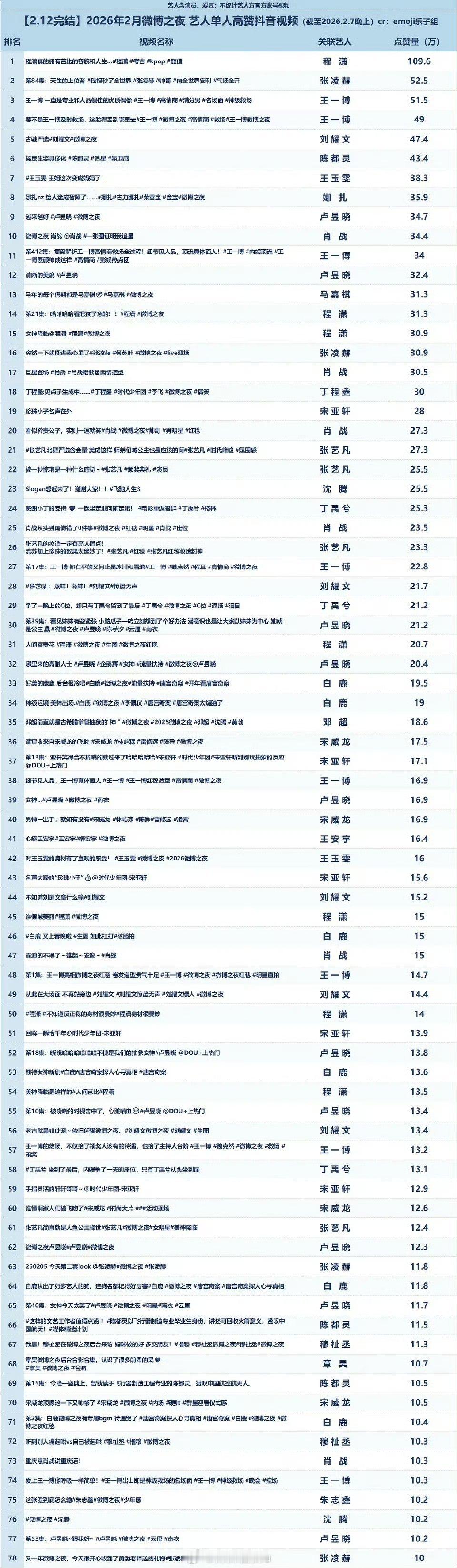 微博之夜艺人抖高赞视频点赞量排名 程潇舞台热度好高,109万赞断层登顶了