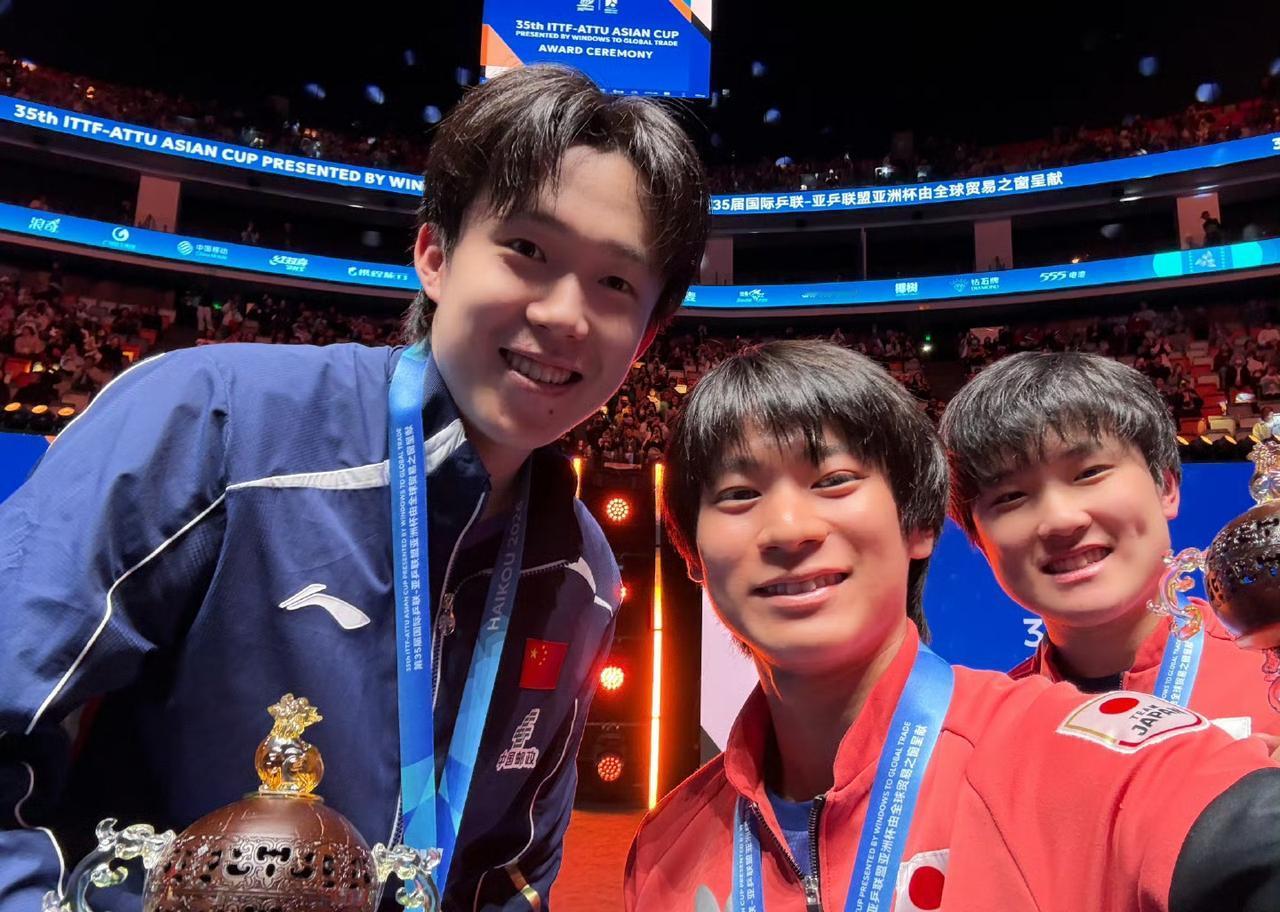 王楚钦咋没有单独拍一张冠军自拍照啊[笑哭], 这是2026海口亚洲杯男单冠亚军自拍照。 不过这张照片拍得不错,王楚钦妥妥的主角,日乒户上隼辅和张本智和像是两个小随从,挤在王楚钦身边陪着笑脸[捂脸]。 不过国乒男队真该重视起来了,要把这两个日乒男甩得远远的才好[奋斗]。