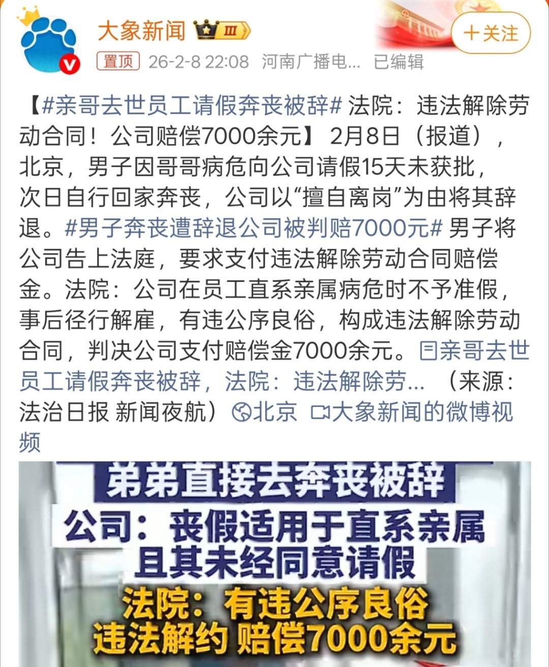 亲哥去世员工请假奔丧被辞亲哥这肯定是直系亲属啊,这都能成为辞退理由太离谱了,而且赔偿7000是不是有点少了,这种比较恶劣的事情完全可以加重,也能起到警示作用。