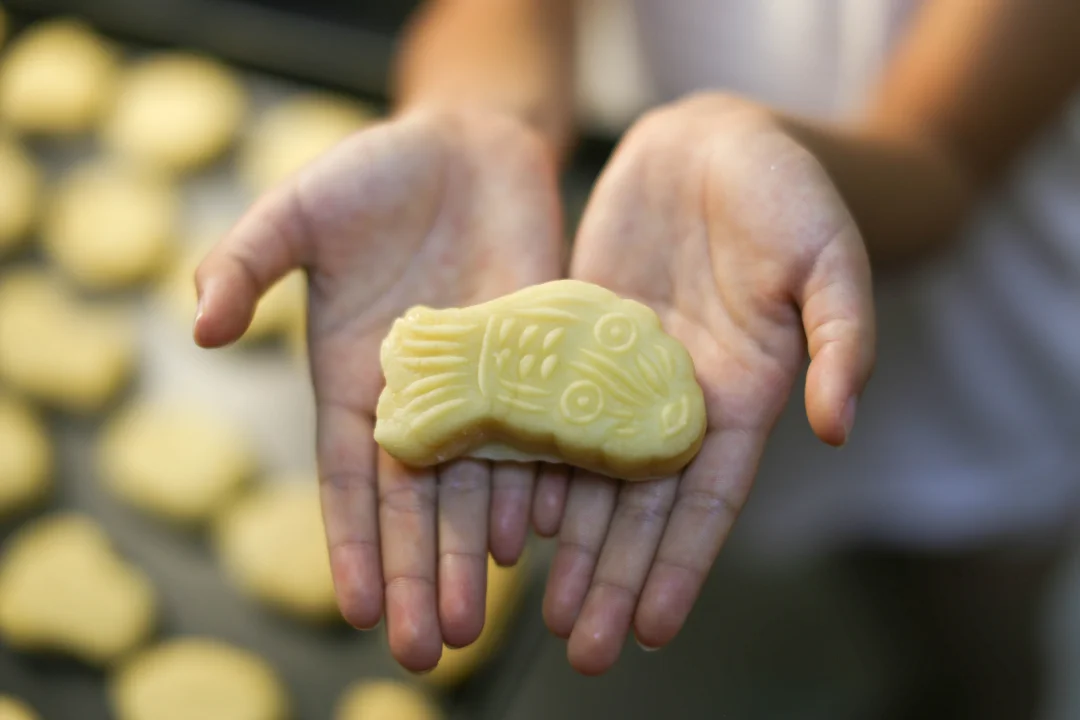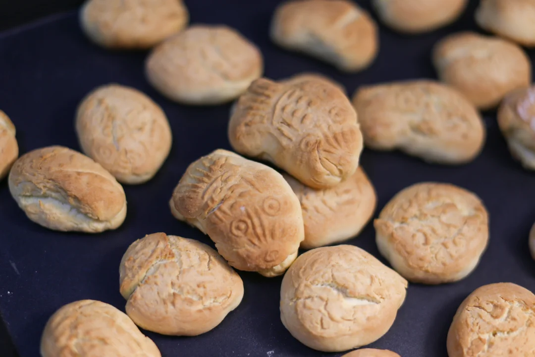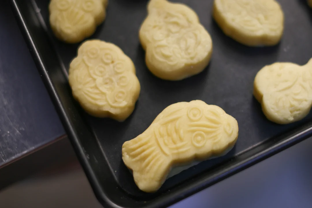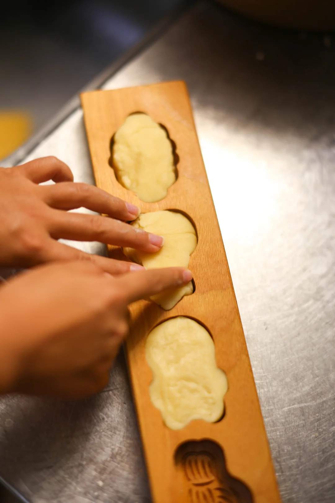 模具也是各式各样,图案种类都不尽相同。面团带着手温和期待放入模具中,压成形状后倒扣出来,面鱼抖着鳞片,花篮提着细纹,从模具中磕下来,仿佛一首交响乐。
