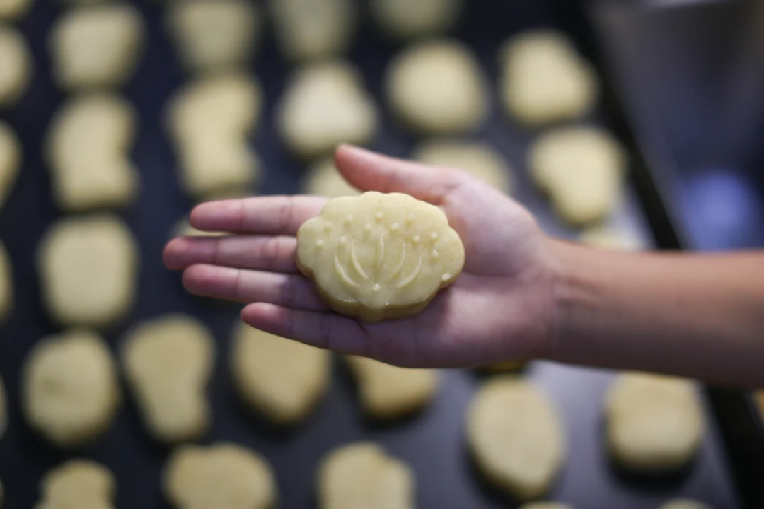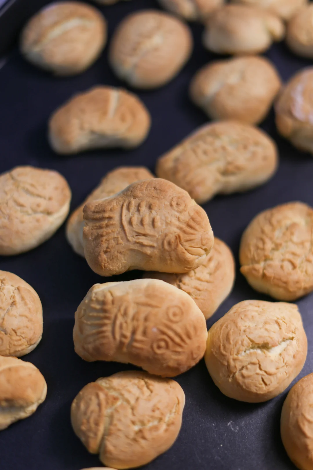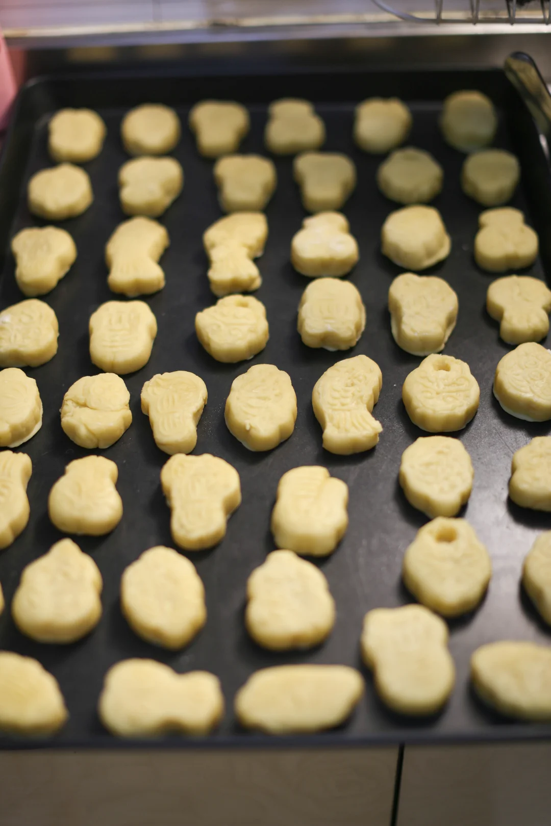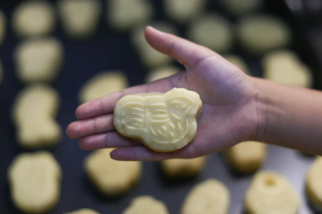 模具也是各式各样,图案种类都不尽相同。面团带着手温和期待放入模具中,压成形状后倒扣出来,面鱼抖着鳞片,花篮提着细纹,从模具中磕下来,仿佛一首交响乐。
