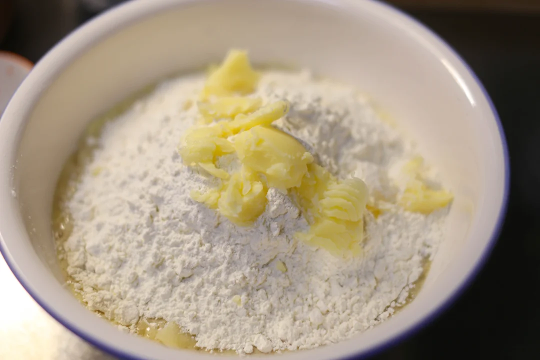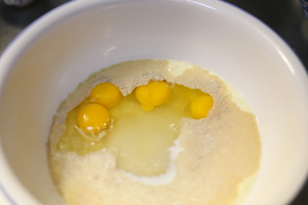 500克低筋酵母粉中加入软化的黄油100克,用酵母水放入面团中,和成面团,饧发。
