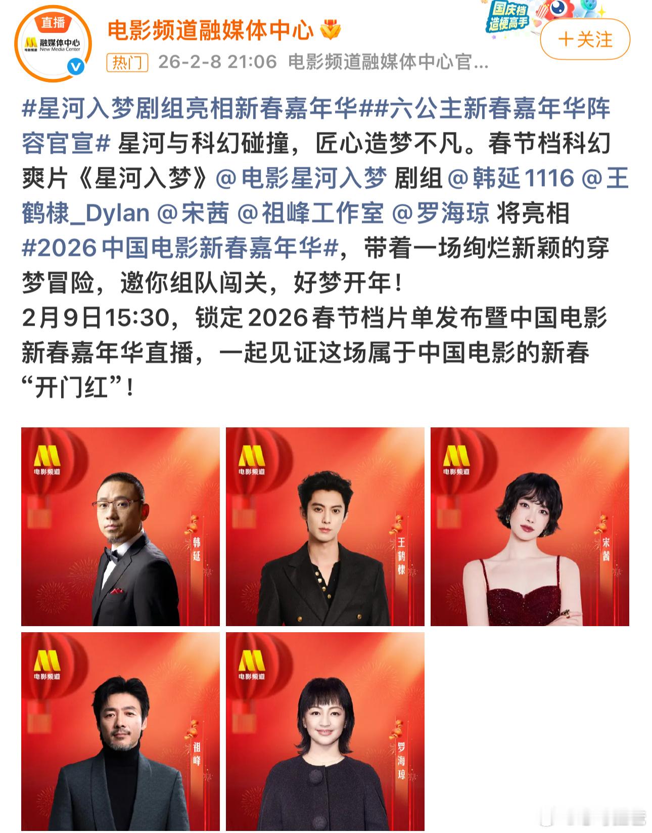 六公主官宣春节档爽片《星河入梦》将于2.9日15.30亮相中国电影新春嘉年华。2.9号刚好是开启预售的日子 开始进入宣传期了 期待明天的预售和王鹤棣