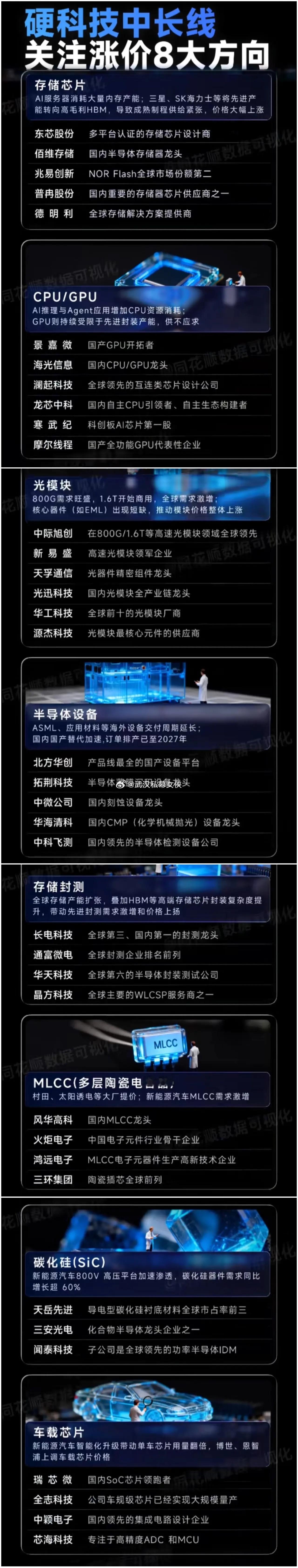 硬核科技中长线聚焦8大涨价主线,核心逻辑为供需缺口+国产替代+技术迭代,以下是各方向核心龙头与关键信息:一、存储芯片涨价逻辑:大厂减产+AI/端侧需求激增,DDR4一季度涨约50%,NORFlash涨20%-30%。龙头:兆易创新(603986)、佰维存储(688525)、普冉股份(688766)。二、光模块涨价逻辑:800G需求爆发、1.6T商用,核心器件短缺推价。龙头:中际旭创(300308)、新易盛(300502)、天孚通信(300394)。三、半导体设备涨价逻辑:海外交期18-24个月,国产替代加速,订单排至2027年。龙头:北方华创(002371)、中微公司(688012)、拓荆科技(688072)。四、存储封测/HBM涨价逻辑:HBM封装复杂度提升,先进封装ASP倍增。龙头:长电科技(600584)、通富微电(002156)、华天科技(002185)。五、碳化硅(SiC)涨价逻辑:800V高压平台渗透,器件需求同比增60%+。龙头:天岳先进(688234)、三安光电(600703)、露笑科技(002617)。六、算力CPU/GPU涨价逻辑:AI算力需求爆发,Intel/AMD涨价15%-20%,供给缺口扩大。龙头:海光信息(688041)、龙芯中科(688047)、景嘉微(300474)。七、被动元件(MLCC等)涨价逻辑:原材料上涨,国内外厂商提价,AI/汽车需求拉动[(微博)]。龙头:三环集团(300408)、风华高科(000636)、顺络电子(002138)。八、稀有金属/材料涨价逻辑:资源稀缺+战略储备+半导体/新能源需求,钨、锑、锗等涨价。龙头:厦门钨业(600549)、湖南黄金(002155)、锡业股份(000960)。投资要点中长线以国产替代+技术壁垒+产能扩张为核心筛选标准,关注业绩兑现与订单增长。