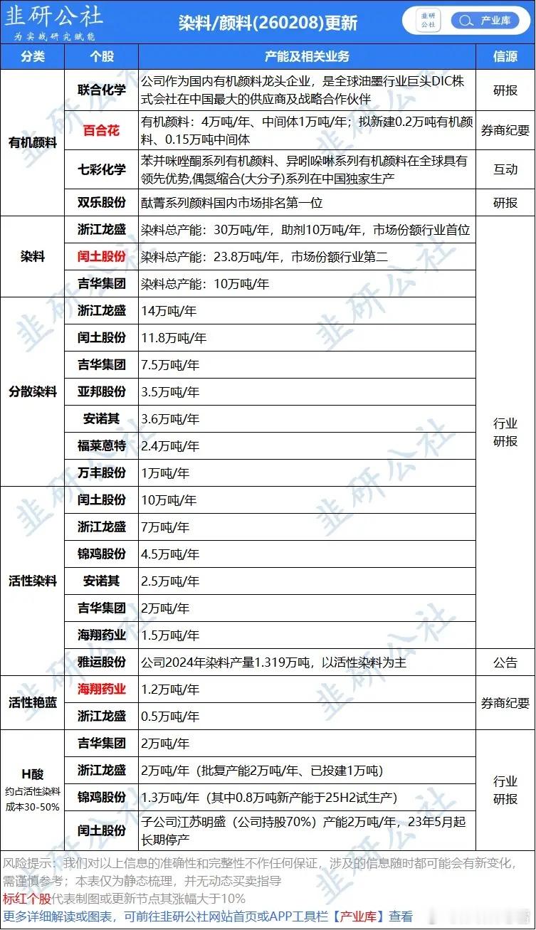 预期差是涨价最快的细分活性艳兰,海翔。以及有机颜料产量市值比最大的百合花。