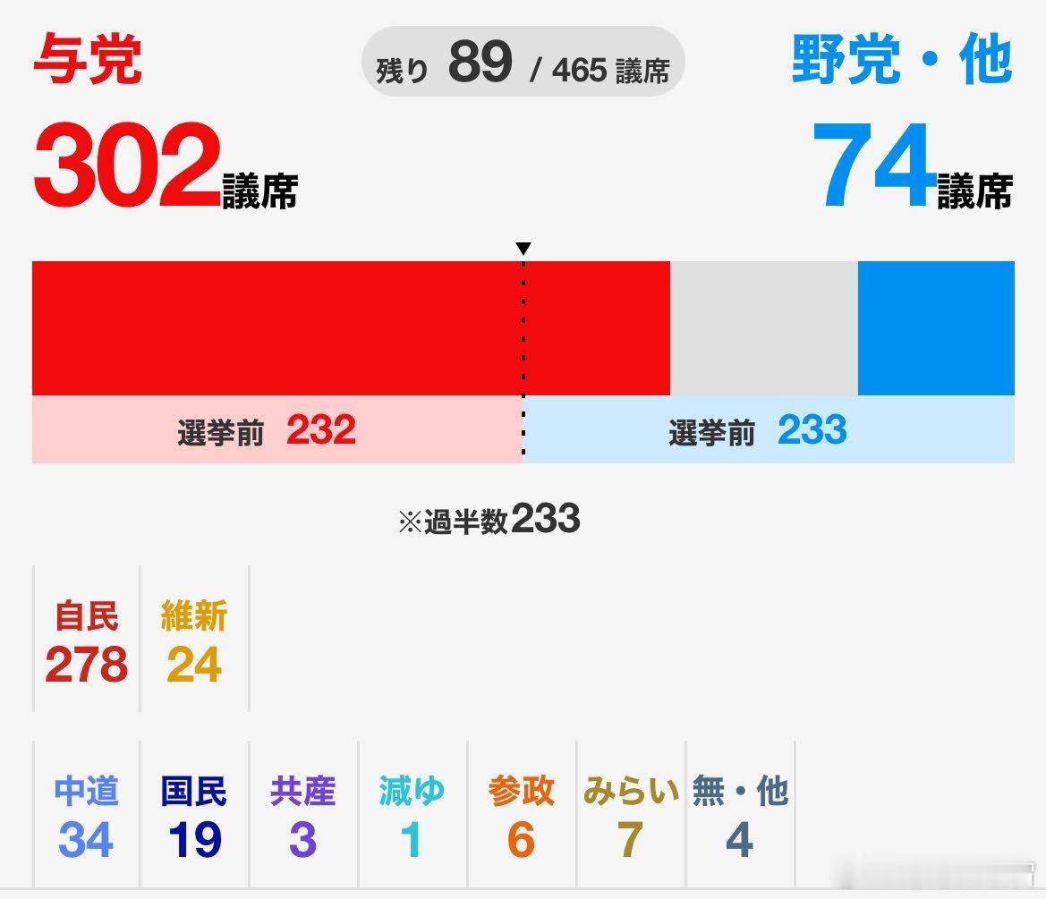 日本众议院选举,目前自民党➕维新会已获得302席,远超233席的半数席位。距离310席的2/3超级多数只差8席!而图发布时还有89席未决,按照这个势头,很有可能拿下310+席。