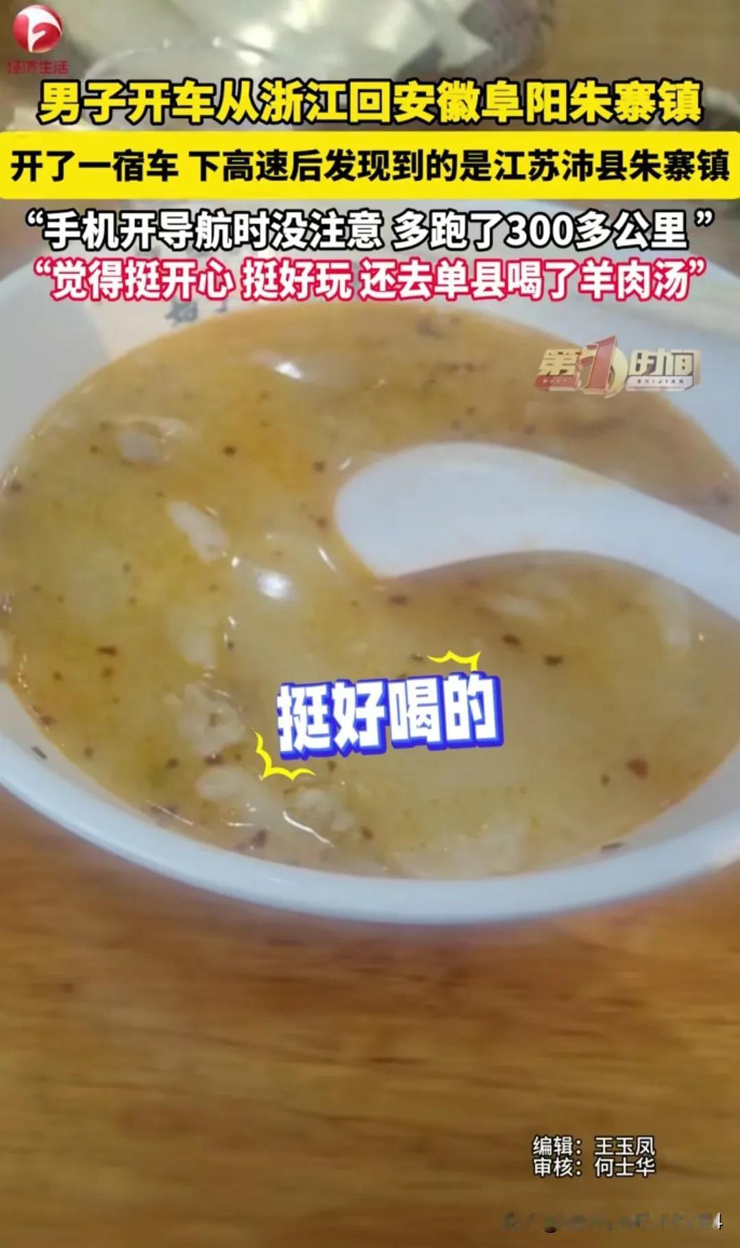 笑死了,俩人才啊!男子两人打算从浙江回安徽阜阳朱寨镇,谁知手机开导航时没注意,一宿下来多跑了300多公里,下高速后才发现到的是江苏沛县朱寨镇。 俩人才心态挺好的,觉得开心好玩,还给自己拍照留了“罪证”,顺便去单县喝了当地的羊肉汤。 视频发出后,网友也纷纷调侃: “到沛县不吃狗肉就走了” “你跑徐州沛县了,然后去单县去喝羊肉汤,沛县的羊肉汤不配喝吗[what]” “来都来了,剋碗冷面,带点狗肉走呗” “20年前南京去丹阳,结果坐车去了马鞍山的一个丹阳镇” “我阜阳出人才,回去再联系一下我,咱喝点”