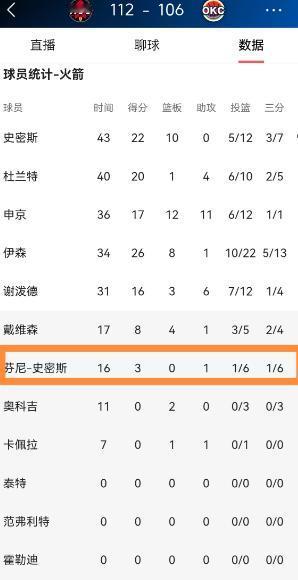 火箭大将芬尼-史密斯的三分球真是让人感到绝望!在今天火箭客场以112:106战胜雷霆的比赛中,芬尼-史密斯在三分线外一如既往的手感冰凉,他在替补出战的16分钟里,三分球6中1极其低效的得到3分,还有2次犯规,他的场上正负值为-9。 2月8日凌晨,NBA常规赛上演一场精彩对决,火箭客场挑战联盟榜首雷霆,最终以112-106成功取胜,结束了此前的两连败,也完成了一场从落后15分到反超的大逆转。 这场胜利确实值得庆祝,伊森砍26分带队追分,申京交出三双,杜兰特高效贡献20分,可替补席上的芬尼-史密斯,却成了这场胜利里最刺眼的存在。 作为去年夏天火箭花大价钱签下的大将,芬尼-史密斯本场替补出战16分钟,表现堪称低迷。 三分线外他出手6次,只命中1球,极其低效地拿到3分,除此之外还有2次犯规,场上正负值更是低至-9,也就是说他在场上的那段时间,火箭净输对手9分。 其实不光这场,芬尼-史密斯伤愈复出后,状态就一直没在线。 去年夏天,火箭用四年5300万美元的合同签下他,当时大家都以为他能成为球队的3D核心,毕竟他上赛季在湖人时,三分命中率还能达到41.1%,防守端也能从一号位防到四号位。 可谁也没想到,本赛季他因左脚踝手术缺席了前两个月,直到圣诞节才完成首秀,复出后就彻底没了往日的状态。 本赛季至今,他的场均出场时间被压缩到15分钟左右,场均只能拿到2.9分2.8篮板,这样的数据配上千万年薪,确实有些说不过去。 就在几天前的交易截止日,火箭零操作,没能送走芬尼-史密斯,说白了不是不想送,而是根本没人要,甚至有消息称,火箭想送走他,还得倒贴选秀权。 这场和雷霆的比赛,火箭整体打得不容易,一度落后15分,靠着第三节单节净胜12分才完成反超,最终靠着首发阵容的出色发挥拿下胜利。 值得一提的是,火箭本场替补席合计只拿到11分,芬尼-史密斯的低效表现,无疑让替补席的得分压力更大。 有人说,芬尼-史密斯的作用不在数据上,高阶数据显示他在场时,火箭的防守效率能达到102,净效率值也不错。 可现实是,火箭签下他,核心就是看中他的三分和防守,如今三分彻底失准,防守端的贡献再大,也难以匹配他的合同。 接下来的比赛,芬尼-史密斯大概率还会留在火箭阵容中,毕竟合同难以出手,球队也需要他在防守端填补轮换空缺。 只是不知道他还能不能找回手感,毕竟现在的他,不仅是自己的状态问题,更占用了球队宝贵的薪资空间,甚至可能影响到后续伊森的续约。 火箭这场赢了雷霆,确实提振了士气,但芬尼-史密斯的低迷,无疑是球队隐藏的隐忧。 32岁的他,还有三年合同在身,若一直保持这样的状态,未来大概率会成为火箭阵容调整的包袱。 以上都是个人观点,对此您有什么不同的看法,可以在评论区留言讨论!!!
