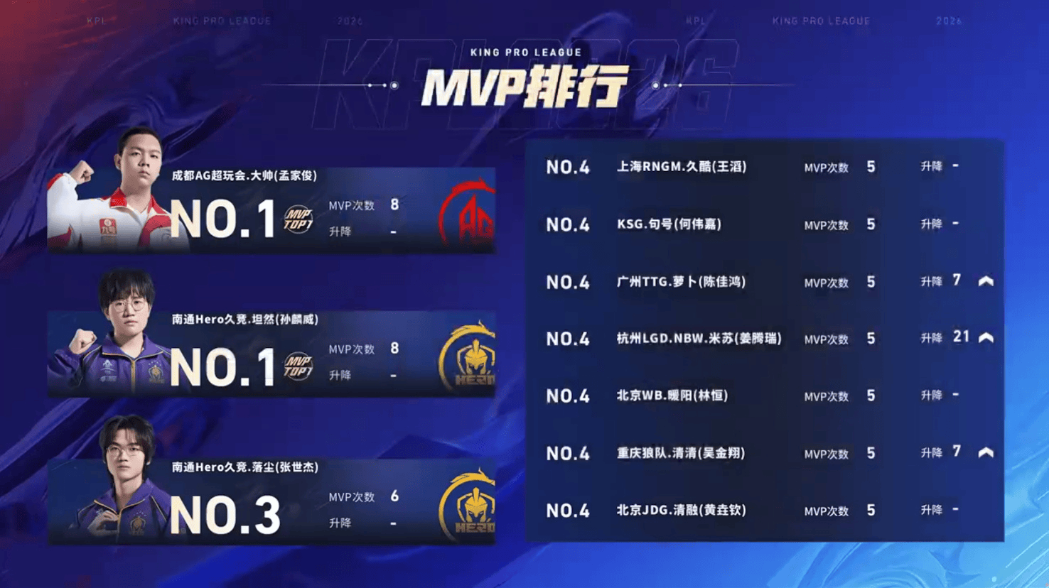 AG大帅11(孟家俊)与南通Hero久竞_坦然(孙麟威)累计获得8次MVP,并列第一;